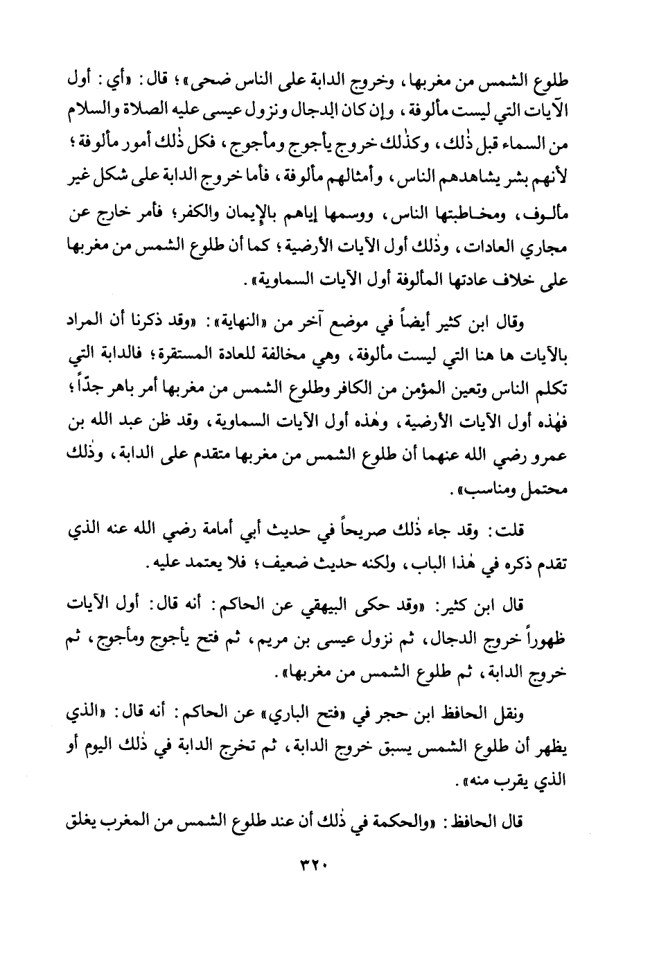 وقال ابن كثير أيضًا في موضع آخر من "النهاية": "وقد ذكرنا أن المراد بالآيات هاهنا التي ليست مألوفة، وهي مخالفة للعادة المستقرة؛ فالدابة التي تكلم الناس وتعين المؤمن من الكافر وطلوع الشمس من مغربها أمر باهر جدًا؛ فهذه أول الآيات الأرضية، وهذه أول الآيات السماوية، وقد ظن عبد الله بن عمرو رضي الله عنهما أن طلوع الشمس من مغربها متقدم على الدابة، وذلك محتمل ومناسب".