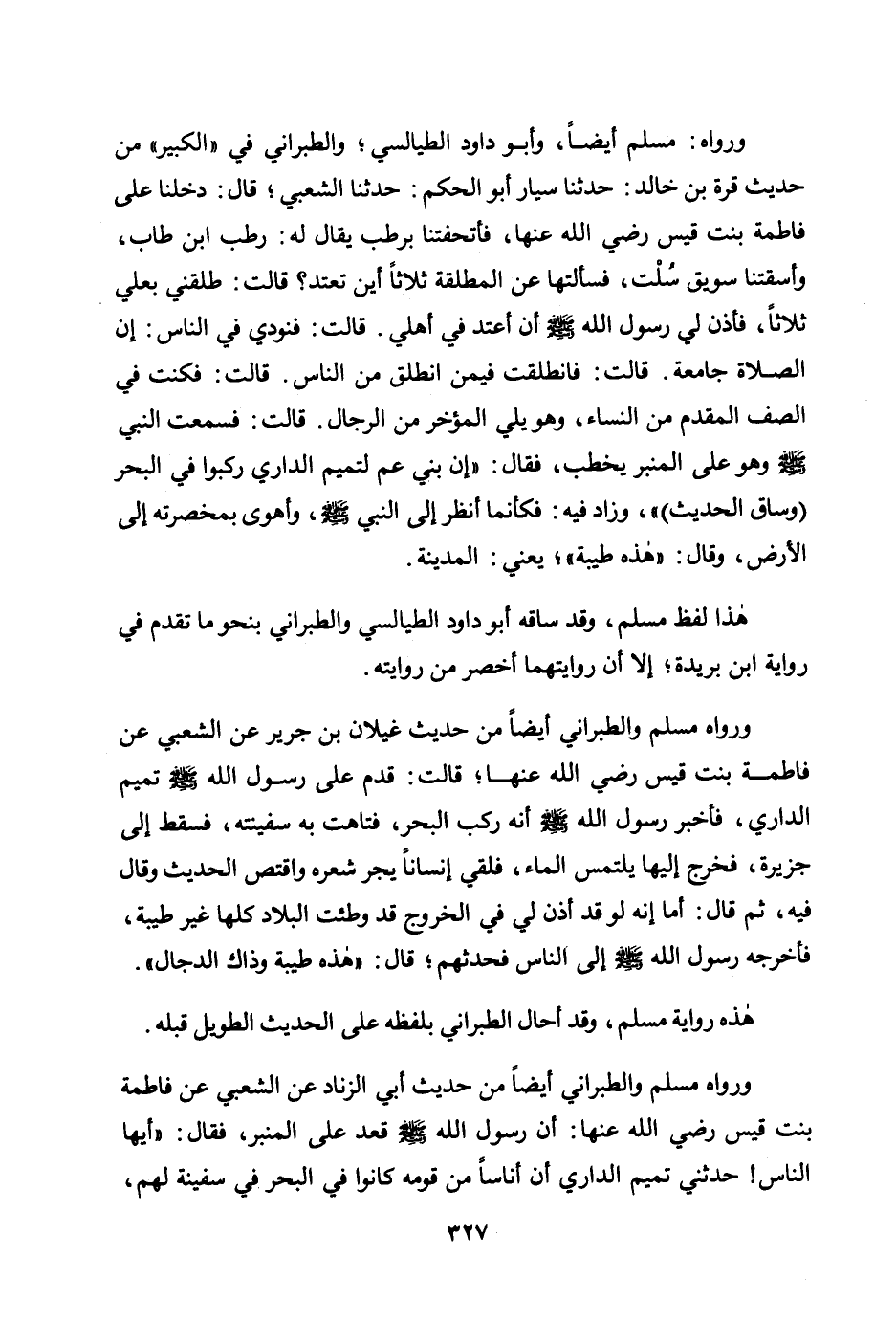 ورواه مسلم والطبراني أيضًا من حديث غيلان بن جرير عن الشعبي عن فاطمة بنت قيس رضي الله عنها؛ قالت: «قدم على رسول الله صلى الله عليه وسلم تميم الداري، فأخبر رسول الله صلى الله عليه وسلم أنه ركب البحر، فتاهت به سفينته، فسقط إلى جزيرة، فخرج إليها يلتمس الماء، فلقي إنسانًا يجر شعره واقتص الحديث وقال فيه، ثم قال: أما إنه لو قد أذن لي في الخروج قد وطئت البلاد كلها غير طيبة، فأخرجه رسول الله صلى الله عليه وسلم إلى الناس فحدثهم؛ قال: "هذه طيبة وذاك الدجال» .