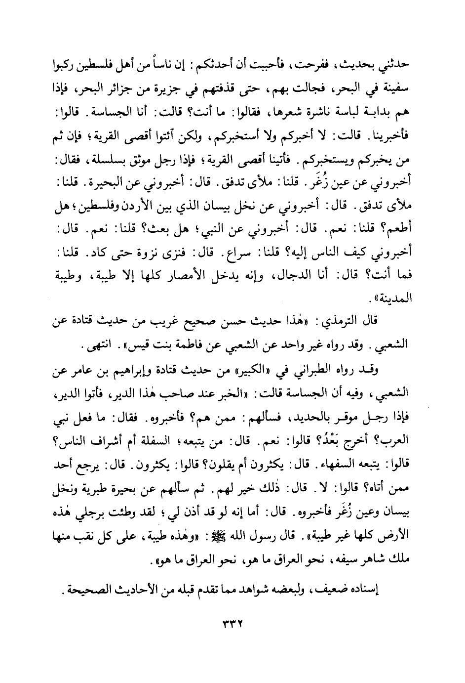 وقد رواه الطبراني في "الكبير" من حديث قتادة وإبراهيم بن عامر عن الشعبي، وفيه أن الجساسة قالت: «الخبر عند صاحب هذا الدير، فأتوا الدير، فإذا رجل موقر بالحديد، فسألهم: ممن هم؟ فأخبروه. فقال: ما فعل نبي العرب؟ أخرج بعد؟ قالوا: نعم. قال: من يتبعه؛ السفلة أم أشراف الناس؟ قالوا: يتبعه السفهاء. قال: يكثرون أم يقلون؟ قالوا: يكثرون. قال: يرجع أحد ممن أتاه؟ قالوا: لا. قال: ذلك خير لهم. ثم سألهم عن بحيرة طبرية ونخل بيسان وعين زغر فأخبروه. قال: أما إنه لو قد أذن لي؛ لقد وطئت برجلي هذه الأرض كلها غير طيبة". قال رسول الله صلى الله عليه وسلم: وهذه طيبة، على كل نقب منها ملك شاهر سيفه، نحو العراق ما هو، نحو العراق ما هو» .