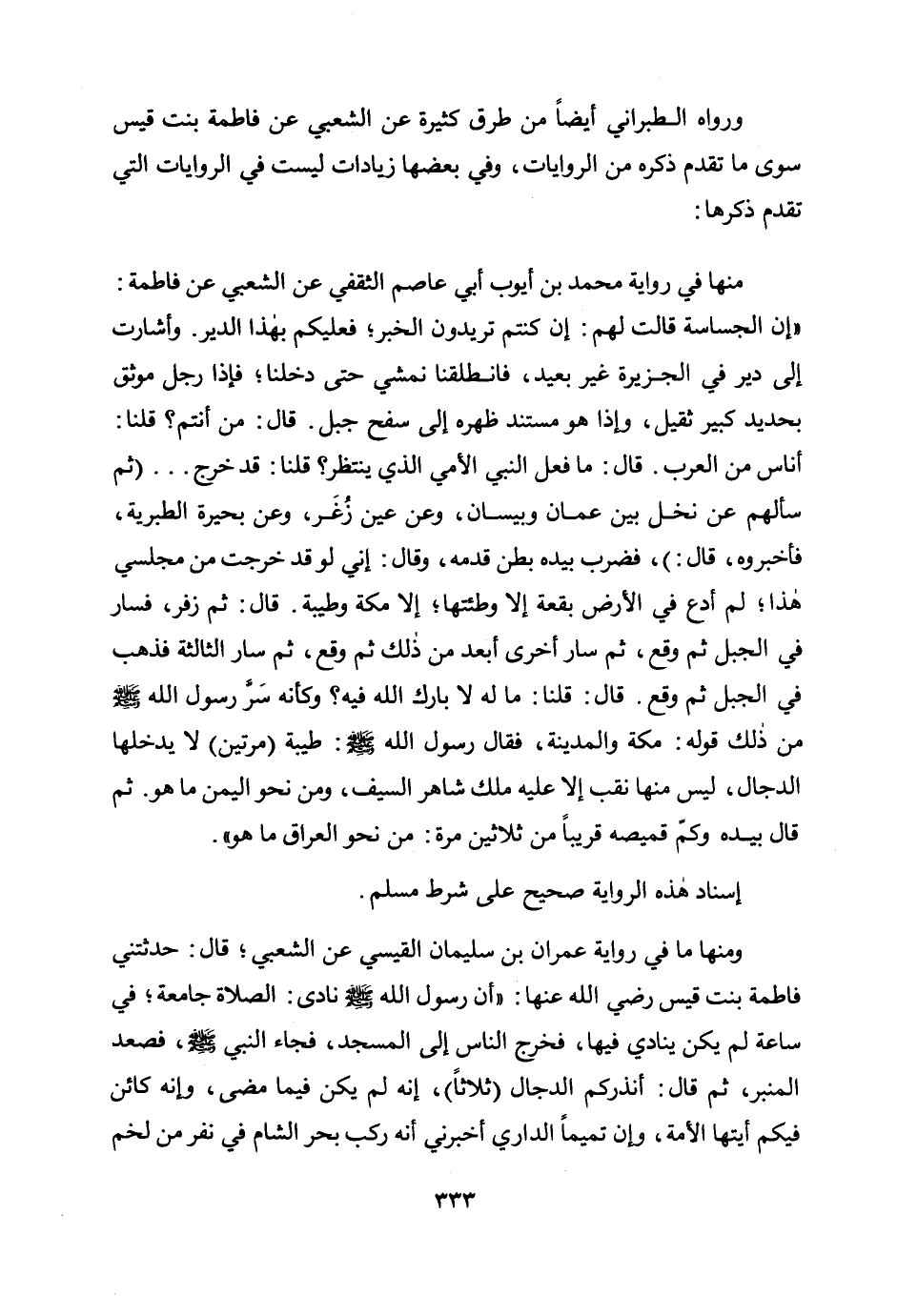 ومنها ما في رواية عمران بن سليمان القيسي عن الشعبي؛ قال: حدثتني فاطمة بنت قيس رضي الله عنها: «أن رسول الله صلى الله عليه وسلم نادى: الصلاة جامعة؛ في ساعة لم يكن ينادي فيها، فخرج الناس إلى المسجد، فجاء النبي صلى الله عليه وسلم، فصعد المنبر، ثم قال: أنذركم الدجال (ثلاثًا) ، إنه لم يكن فيما مضى، وإنه كائن فيكم أيتها الأمة، وإن تميمًا الداري أخبرني أنه ركب بحر الشام في نفر من لخم»