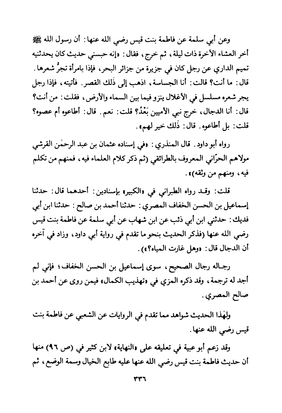 وعن أبي سلمة عن فاطمة بنت قيس رضي الله عنها: «أن رسول الله صلى الله عليه وسلم أخر العشاء الآخرة ذات ليلة، ثم خرج، فقال: "إنه حبسني حديث كان يحدثنيه تميم الداري عن رجل كان في جزيرة من جزائر البحر، فإذا بامرأة تجر شعرها. قال: ما أنت؟ قالت: أنا الجساسة، اذهب إلى ذلك القصر. فأتيته، فإذا رجل يجر شعره مسلسل في الأغلال ينزو فيما بين السماء والأرض، فقلت: من أنت؟ قال: أنا الدجال، خرج نبي الأميين بعد؟ قلت: نعم. قال: أطاعوه أم عصوه؟ قلت: بل أطاعوه. قال: ذلك خير لهم» .