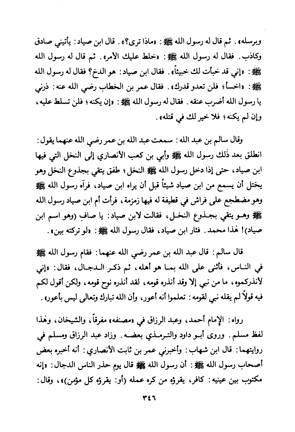 وقال سالم بن عبد الله: سمعت عبد الله بن عمر رضي الله عنهما يقول: «انطلق بعد ذلك رسول الله صلى الله عليه وسلم وأبي بن كعب الأنصاري إلى النخل التي فيها ابن صياد، حتى إذا دخل رسول الله صلى الله عليه وسلم النخل؛ طفق يتقي بجذوع النخل وهو يختل أن يسمع من ابن صياد شيئًا قبل أن يراه ابن صياد، فرآه رسول الله صلى الله عليه وسلم وهو مضطجع على فراش في قطيفة له فيها زمزمة، فرأت أم ابن صياد رسول الله صلى الله عليه وسلم وهو يتقي بجذوع النخل، فقالت لابن صياد: يا صاف (وهو اسم ابن صياد) ! هذا محمد. فثار ابن صياد، فقال رسول الله صلى الله عليه وسلم: "لو تركته بين» .
