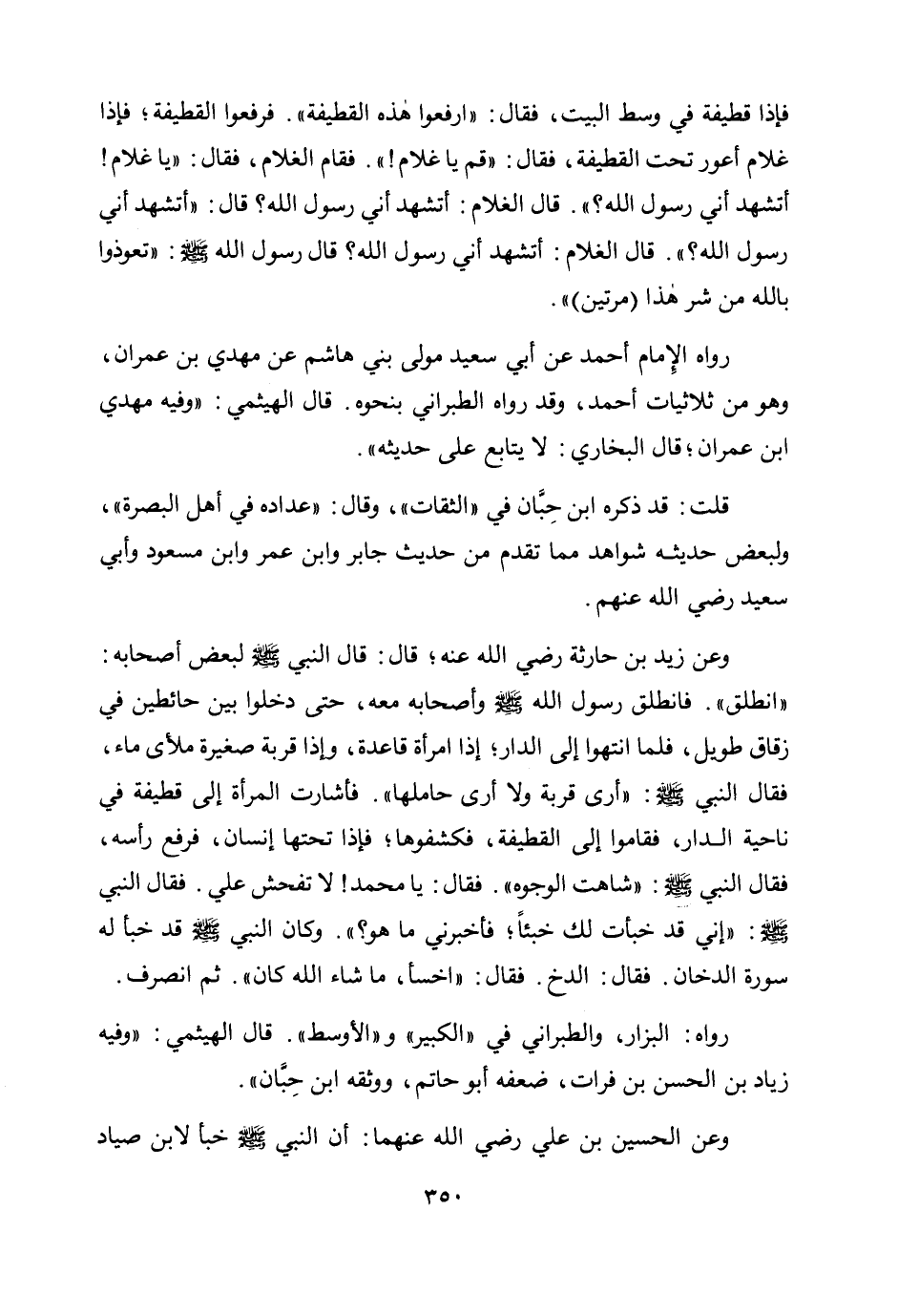 وعن زيد بن حارثة رضي الله عنه؛ قال: «قال النبي صلى الله عليه وسلم لبعض أصحابه: "انطلق". فانطلق رسول الله صلى الله عليه وسلم وأصحابه معه، حتى دخلوا بين حائطين في زقاق طويل، فلما انتهوا إلى الدار؛ إذا امرأة قاعدة، وإذا قربة صغيرة ملأى ماء، فقال النبي صلى الله عليه وسلم: "أرى قربة ولا أرى حاملها". فأشارت المرأة إلى قطيفة في ناحية الدار، فقاموا إلى القطيفة، فكشفوها؛ فإذا تحتها إنسان، فرفع رأسه، فقال النبي صلى الله عليه وسلم: "شاهت الوجوه". فقال: يا محمد! لا تفحش علي. فقال النبي صلى الله عليه وسلم: "إني قد خبأت لك خبئًا؛ فأخبرني ما هو؟ ". وكان النبي صلى الله عليه وسلم قد خبأ له سورة الدخان. فقال: الدخ. فقال: "اخسأ، ما شاء الله كان". ثم انصرف» .