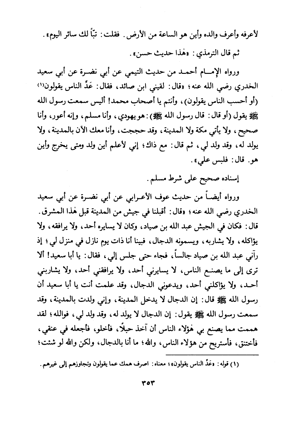 ورواه أيضًا من حديث عوف الأعرابي عن أبي نضرة عن أبي سعيد الخدري رضي الله عنه؛ "قال: «أقبلنا في جيش من المدينة قبل هذا المشرق. قال: فكان في الجيش عبد الله بن صياد، وكان لا يسايره أحد، ولا يرافقه، ولا يؤاكله، ولا يشاربه، ويسمونه الدجال، فبينا أنا ذات يوم نازل في منزل لي، إذ رآني عبد الله بن صياد جالسًا، فجاء حتى جلس إلي، فقال: يا أبا سعيد! ألا ترى إلى ما يصنع الناس، لا يسايرني أحد، ولا يرافقني أحد، ولا يشاربني أحد، ولا يؤاكلني أحد، ويدعوني الدجال، وقد علمت أنت يا أبا سعيد أن رسول الله صلى الله عليه وسلم قال: إن الدجال لا يدخل المدينة، وإني ولدت بالمدينة، وقد سمعت رسول الله صلى الله عليه وسلم يقول: إن الدجال لا يولد له، وقد ولد لي، فوالله؛ لقد هممت مما يصنع بي هؤلاء الناس أن آخذ حبلًا، فأخلو، فأجعله في عنقي، فأختنق، فأستريح من هؤلاء الناس، والله؛ ما أنا بالدجال، ولكن والله لو شئت؛»