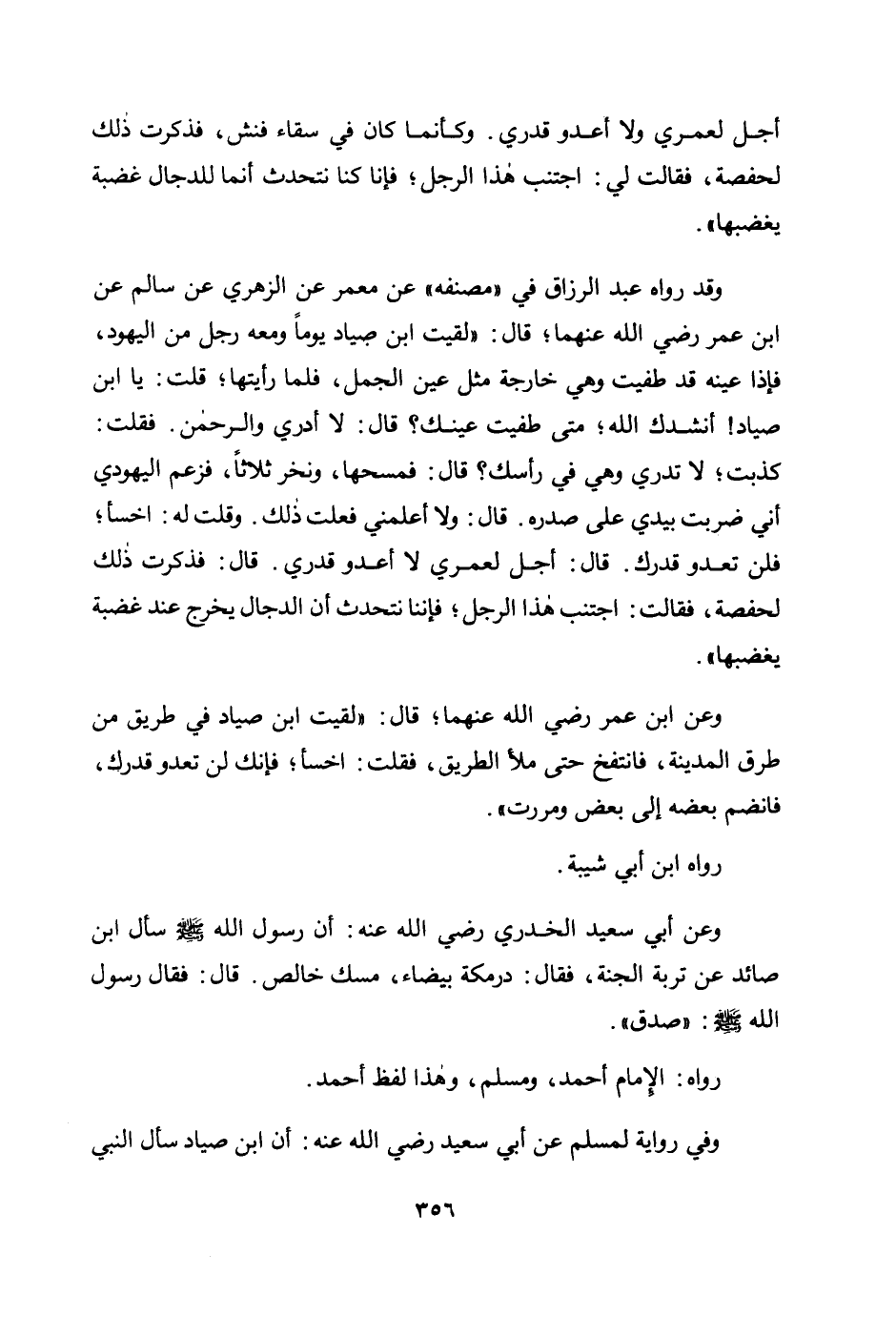 وقد رواه عبد الرزاق في "مصنفه" عن معمر عن الزهري عن سالم عن ابن عمر رضي الله عنهما؛ قال: "لقيت ابن صياد يومًا ومعه رجل من اليهود، فإذا عينه قد كفيت وهي خارجة مثل عين الجمل، فلما رأيتها؛ قلت: يا ابن صياد! أنشدك الله؛ متى طفيت عينك؟ قال: لا أدري والرحمن. فقلت: كذبت، لا تدري وهي في رأسك! قال: فمسحها، ونخر ثلاثًا، فزعم اليهودي أني ضربت بيدي على صدره. قال: ولا أعلمني فعلت ذلك. وقلت له: اخسأ؛ فلن تعدو قدرك. قال: أجل لعمري ولا أعدو قدري. قال: فذكرت ذلك لحفصة، فقالت لي: اجتنب هذا الرجل؛ فإنا نتحدث أن الدجال يخرج عند غضبة يغضبها".
