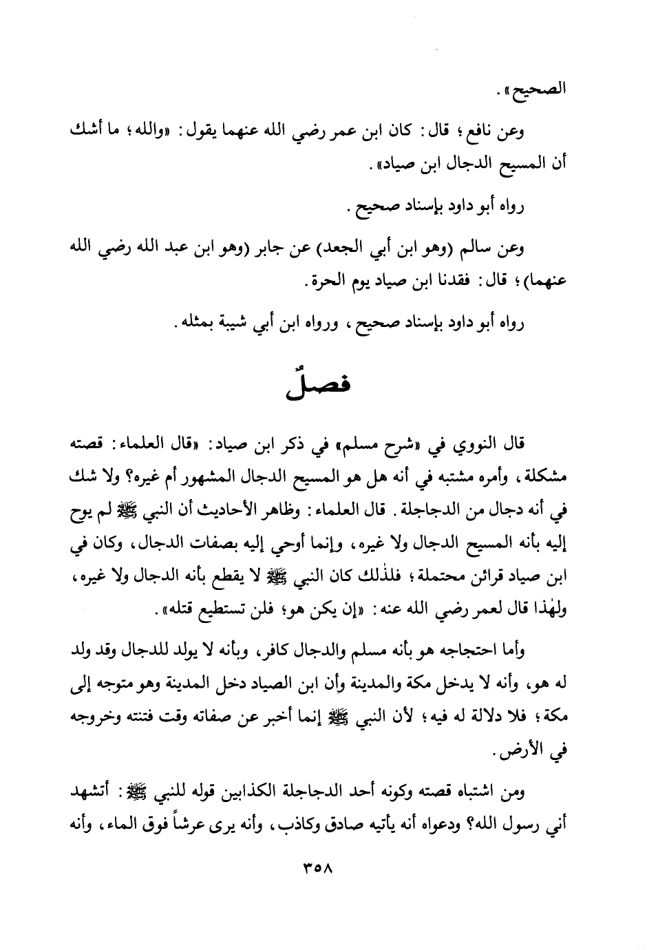 وأما احتجاجه هو بأنه مسلم والدجال كافر، وبأنه لا يولد للدجال وقد ولد له هو، وأنه لا يدخل مكة والمدينة وأن ابن الصياد دخل المدينة وهو متوجه إلى مكة؛ فلا دلالة له فيه؛ لأن النبي صلى الله عليه وسلم إنما أخبر عن صفاته وقت فتنته وخروجه في الأرض.