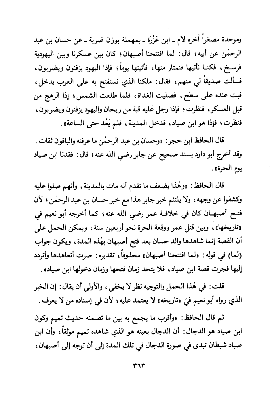 قال الحافظ: "وهذا يضعف ما تقدم أنه مات بالمدينة، وأنهم صلوا عليه وكشفوا عن وجهه، ولا يلتئم خبر جابر هذا مع خبر حسان بن عبد الرحمن؛ لأن فتح أصبهان كان في خلافة عمر رضي الله عنه؛ كما أخرجه أبو نعيم في "تاريخها"، وبين قتل عمر ووقعة الحرة نحو أربعين سنة، ويمكن الحمل على أن القصة إنما شاهدها والد حسان بعد فتح أصبهان بهذه المدة، ويكون جواب (لما) في قوله: "لما افتتحنا أصبهان" محذوفًا، تقديره: صرت أتعاهدها وأتردد إليها فجرت قصة ابن صياد، فلا يتحد زمان فتحها وزمان دخولها ابن صياد ".