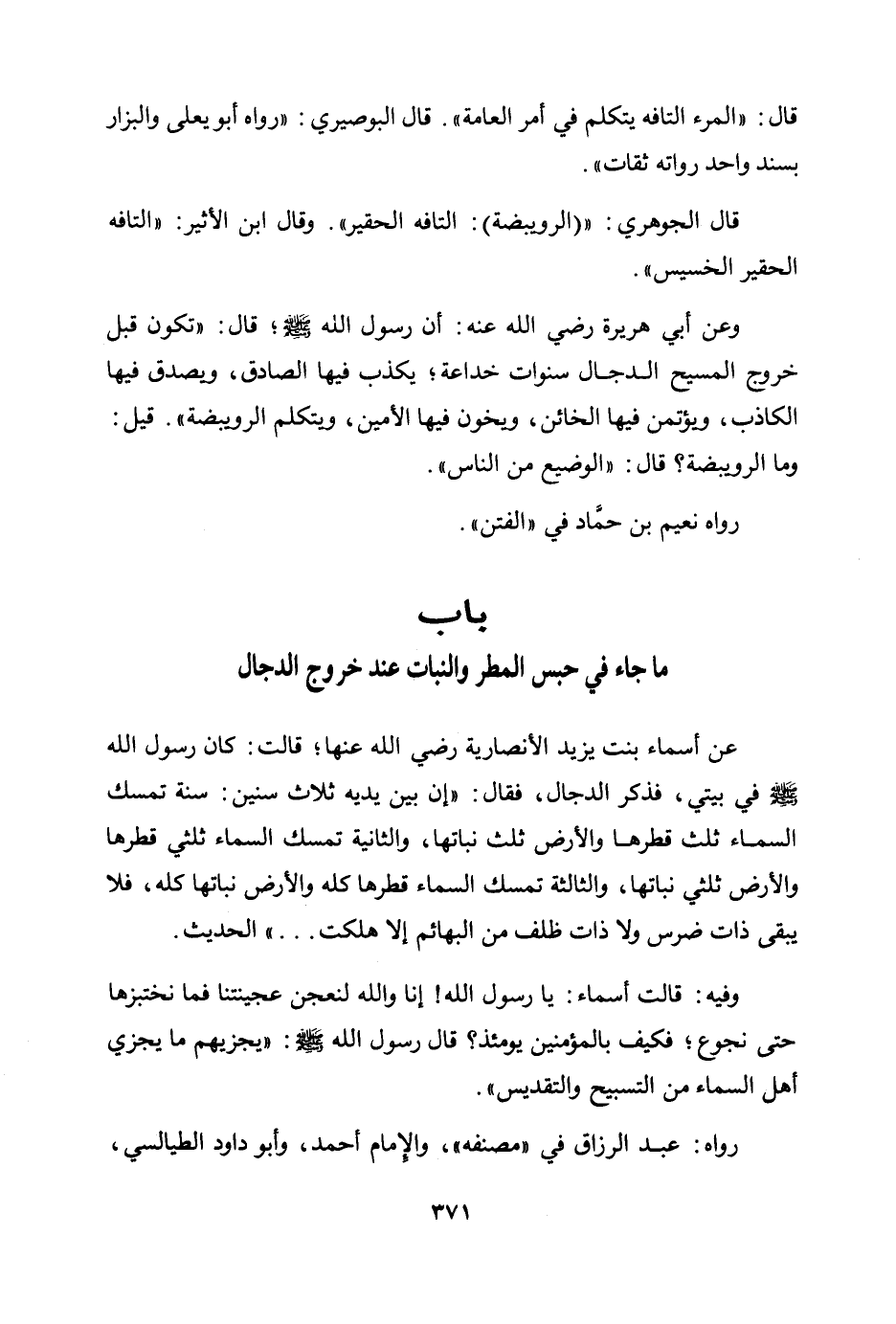 وعن أبي هريرة رضي الله عنه: أن رسول الله صلى الله عليه وسلم؛ قال: «"تكون قبل خروج المسيح الدجال سنوات خداعة؛ يكذب فيها الصادق، ويصدق فيها الكاذب، ويؤتمن فيها الخائن، ويخون فيها الأمين، ويتكلم الرويبضة". قيل: وما الرويبضة؟ قال: "الوضيع من الناس» .