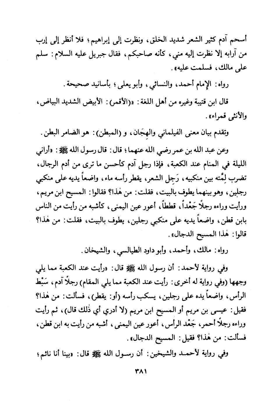 وعن عبد الله بن عمر رضي الله عنهما؛ قال: قال رسول الله صلى الله عليه وسلم: «أراني الليلة في المنام عند الكعبة، فإذا رجل آدم كأحسن ما ترى من أدم الرجال، تضرب لمته بين منكبيه، رجل الشعر، يقطر رأسه ماء، واضعًا يديه على منكبي رجلين، وهو بينهما يطوف بالبيت، فقلت: من هذا؟ فقالوا: المسيح ابن مريم، ورأيت وراءه رجلًا جعدًا، قططًا، أعور عين اليمنى، كأشبه من رأيت من الناس بابن قطن، واضعًا يديه على منكبي رجلين، يطوف بالبيت، فقلت: من هذا؟ قالوا: هذا المسيح الدجال» .