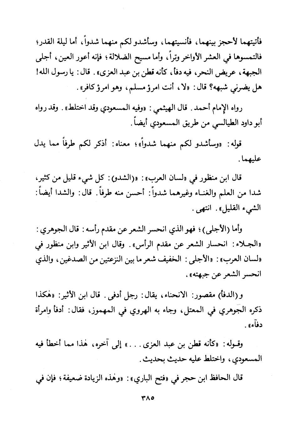 «فأتيتهما لأحجز بينهما، فأنسيتهما، وسأشدو لكم منهما شدوًا، أما ليلة القدر؛ فالتمسوها في العشر الأواخر وترًا، وأما مسيح الضلالة؛ فإنه أعور العين، أجلى الجبهة، عريض النحر، فيه دفأ، كأنه قطن بن عبد العزى ". قال: يا رسول الله! هل يضرني شبهه؟ قال: "لا، أنت امرؤ مسلم، وهو امرؤ كافر» .