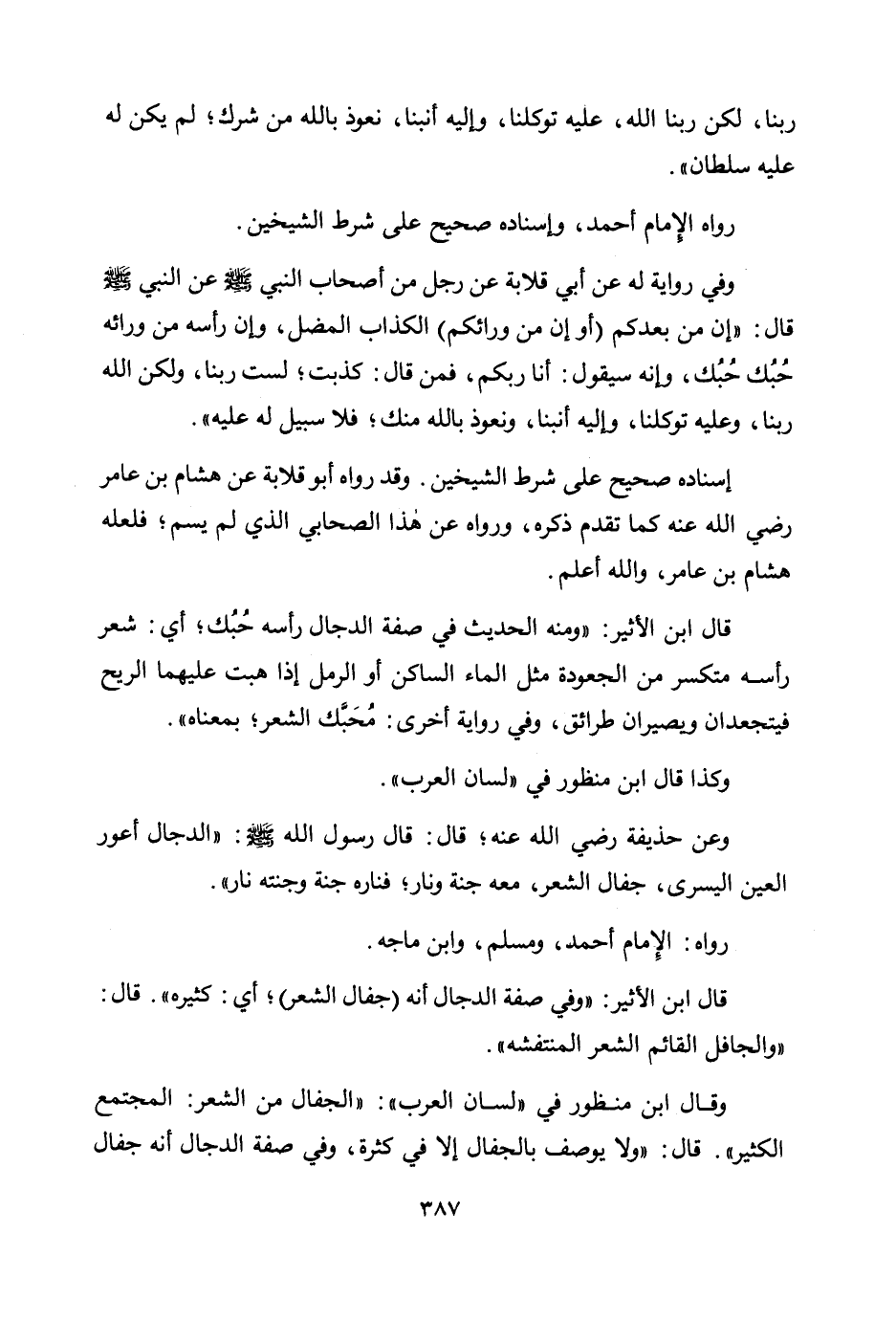 قال ابن الأثير: "وفي صفة الدجال أنه (جفال الشعر) ؛ أي: كثيره". قال: "والجافل القائم الشعر المنتفشه ".