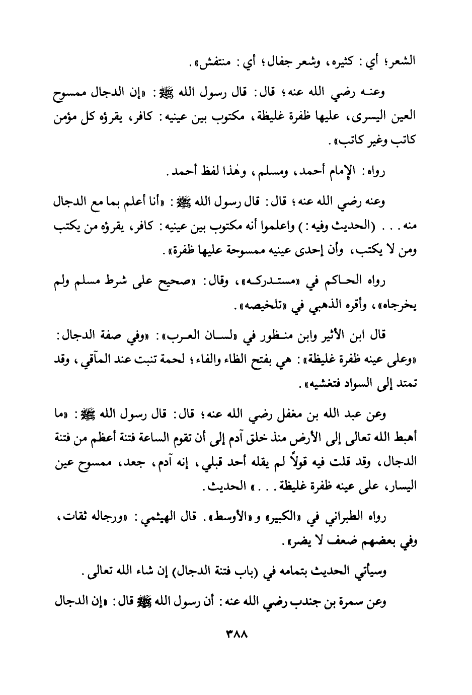وعن عبد الله بن مغفل رضي الله عنه؛ قال: قال رسول الله صلى الله عليه وسلم: «ما أهبط الله تعالى إلى الأرض منذ خلق آدم إلى أن تقوم الساعة فتنة أعظم من فتنة الدجال، وقد قلت فيه قولًا لم يقله أحد قبلي، إنه آدم، جعد، ممسوح عين اليسار، على عينه ظفرة غليظة ... » الحديث.