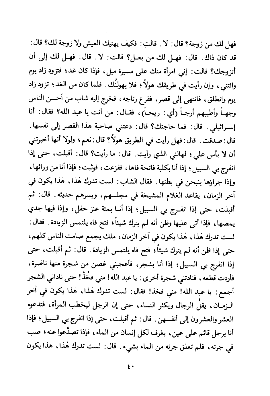 فهل لك من زوجة؟ قال: لا. قالت: فكيف يهنيك العيش ولا زوجة لك؟ قال: قد كان ذاك. قال: فهل لك من بعل؟ قالت: لا. قال: فهل لك إلى أن أتزوجك؟ قالت: إني امرأة منك على مسيرة ميل، فإذا كان غدا؛ فتزود زاد يوم وائتني، وإن رأيت في طريقك هولًا؛ فلا يهولنك. فلما كان من الغد؛ تزود زاد يوم وانطلق، فانتهى إلى قصر، فقرع رتاجه، فخرج إليه شاب من أحسن الناس وجهًا وأطيبهم أرجًا (أي: ريحًا) ، فقال: من أنت يا عبد الله؟ فقال: أنا إسرائيلي. قال: فما حاجتك؟ قال: دعتني صاحبة هذا القصر إلى نفسها. قال: صدقت. قال: فهل رأيت في الطريق هولًا؟ قال: نعم؛ ولولا أنها أخبرتني أن لا بأس علي؛ لهالني الذي رأيت. قال: ما رأيت؟ قال: أقبلت، حتى إذا انفرج بي السبيل؛ إذا أنا بكلبة فاتحة فاها، ففزعت، فوثبت؛ فإذا أنا من ورائها، وإذا جراؤها ينبحن في بطنها. فقال الشاب: لست تدرك هذا، هذا يكون في آخر الزمان، يقاعد الغلام المشيخة في مجلسهم، ويسرهم حديثه. قال: ثم أقبلت، حتى إذا انفرج بي السبيل؛ إذا أنا بمائة عنز حفل، وإذا فيها جدي يمصها، فإذا أتى عليها وظن أنه لم يترك شيئًا؛ فتح فاه يلتمس الزيادة. فقال: لست تدرك هذا، هذا يكون في آخر الزمان، ملك يجمع صامت الناس كلهم، حتى إذا ظن أنه لم يترك شيئًا؛ فتح فاه يلتمس الزيادة. قال: ثم أقبلت، حتى إذا انفرج بي السبيل؛ إذا أنا بشجر، فأعجبني غصن من شجرة منها ناضرة، فأردت قطعه، فنادتني شجرة أخرى: يا عبد الله! مني فخذ! حتى ناداني الشجر أجمع: يا عبد الله! مني فخذ! فقال: لست تدرك هذا، هذا يكون في آخر الزمان، يقل الرجال ويكثر النساء، حتى إن الرجل ليخطب المرأة، فتدعوه العشر والعشرون إلى أنفسهن. قال: ثم أقبلت، حتى إذا انفرج بي السبيل؛ فإذا أنا برجل قائم على عين، يغرف لكل إنسان من الماء، فإذا تصدعوا عنه؛ صب في جرته، فلم تعلق جرته من الماء بشيء. قال: لست تدرك هذا، هذا يكون