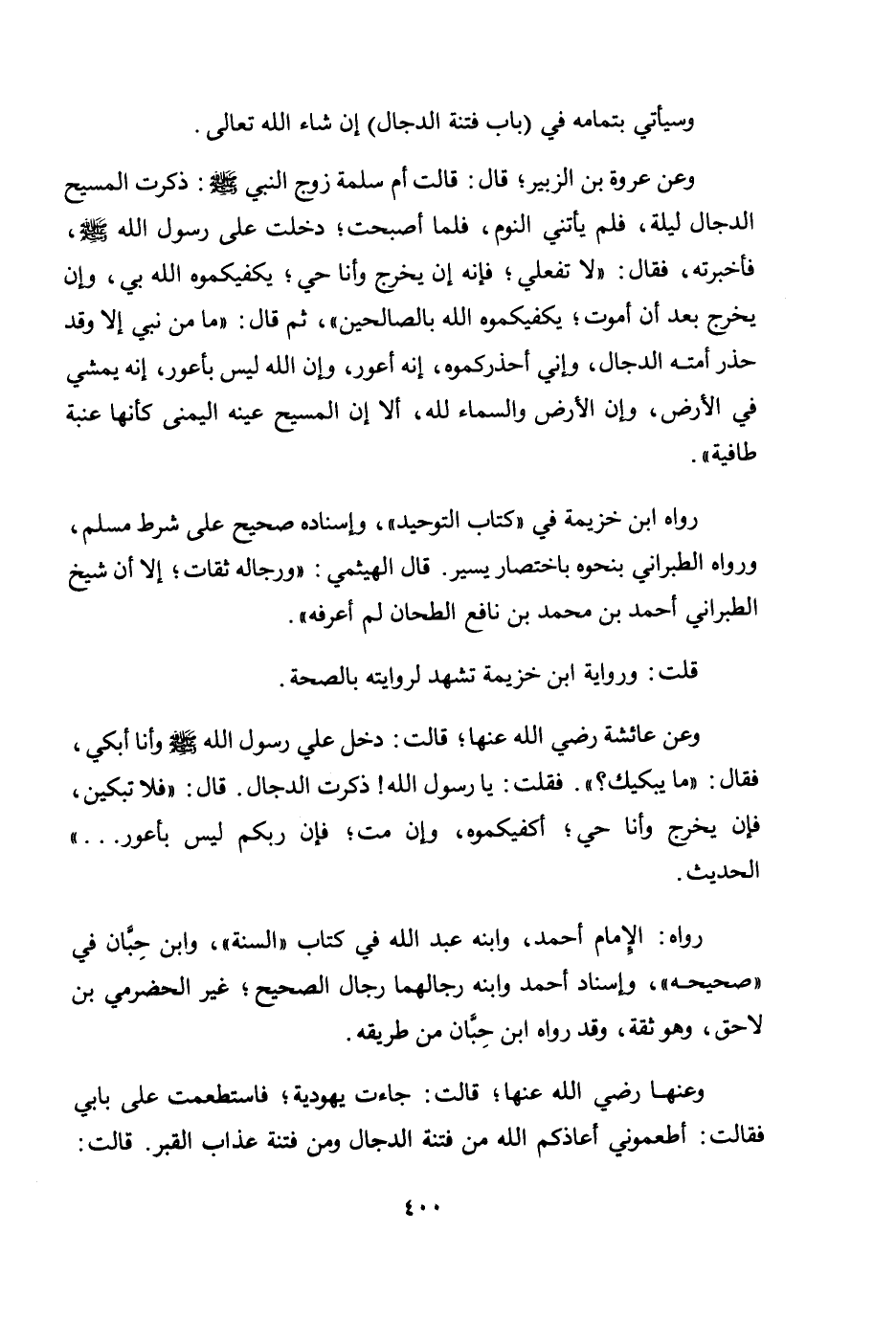 «وعن عائشة رضي الله عنها؛ قالت: دخل علي رسول الله صلى الله عليه وسلم وأنا أبكي، فقال: "ما يبكيك؟ ". فقلت: يا رسول الله! ذكرت الدجال. قال: "فلا تبكين، فإن يخرج وأنا حي؛ أكفيكموه، وإن مت؛ فإن ربكم ليس بأعور.....» الحديث.