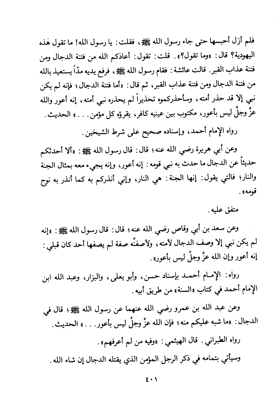 وعن سعد بن أبي وقاص رضي الله عنه؛ قال: قال رسول الله صلى الله عليه وسلم: «إنه لم يكن نبي إلا وصف الدجال لأمته، ولأصفنه صفة لم يصفها أحد كان قبلي: إنه أعور وإن الله عز وجل ليس بأعور» .