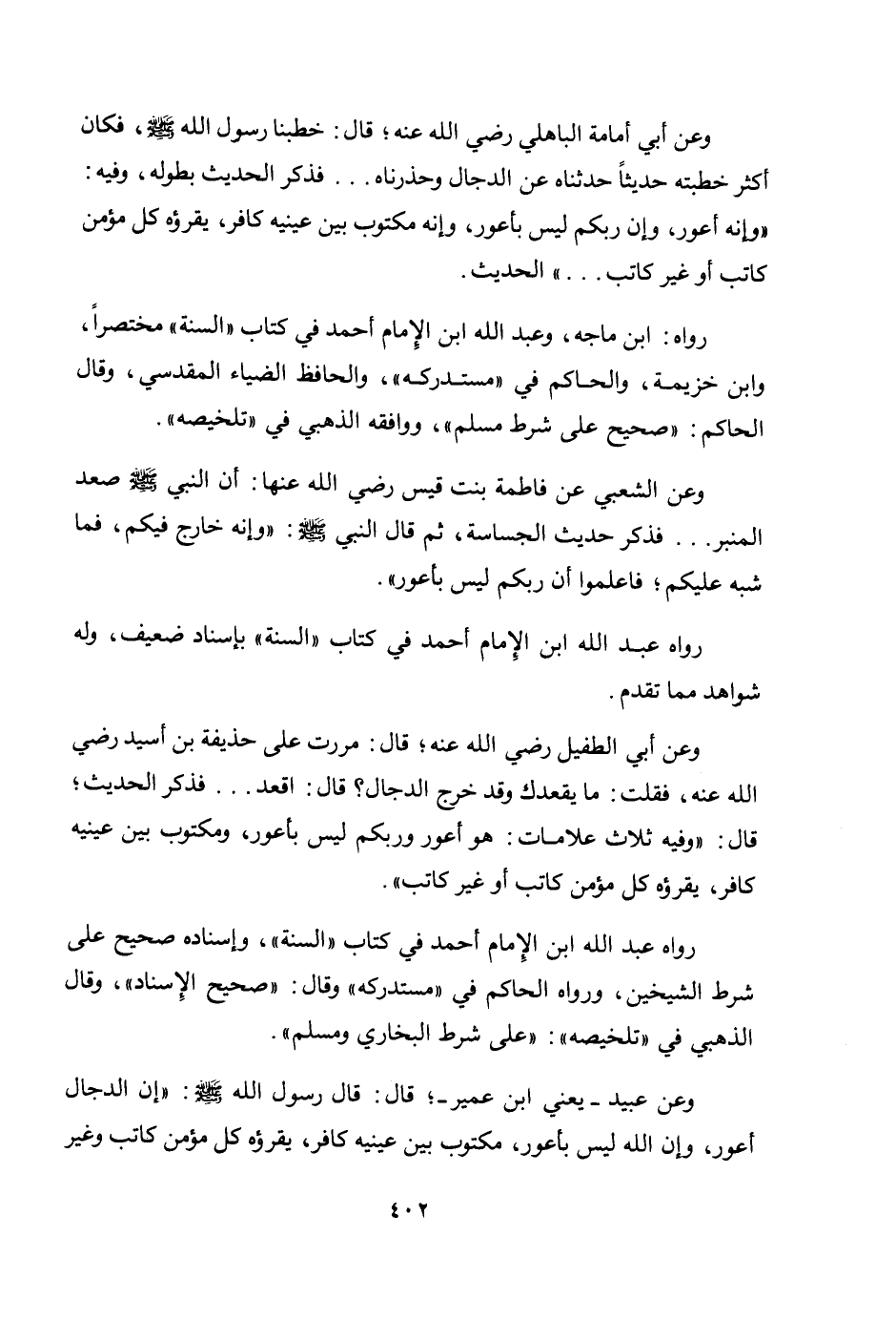 وعن أبي أمامة الباهلي رضي الله عنه؛ قال: «خطبنا رسول الله صلى الله عليه وسلم، فكان أكثر خطبته حديثًا حدثناه عن الدجال وحذرناه ... فذكر الحديث بطوله، وفيه: "وإنه أعور، وإن ربكم ليس بأعور، وإنه مكتوب بين عينيه كافر، يقرؤه كل مؤمن كاتب أو غير كاتب ... » الحديث.