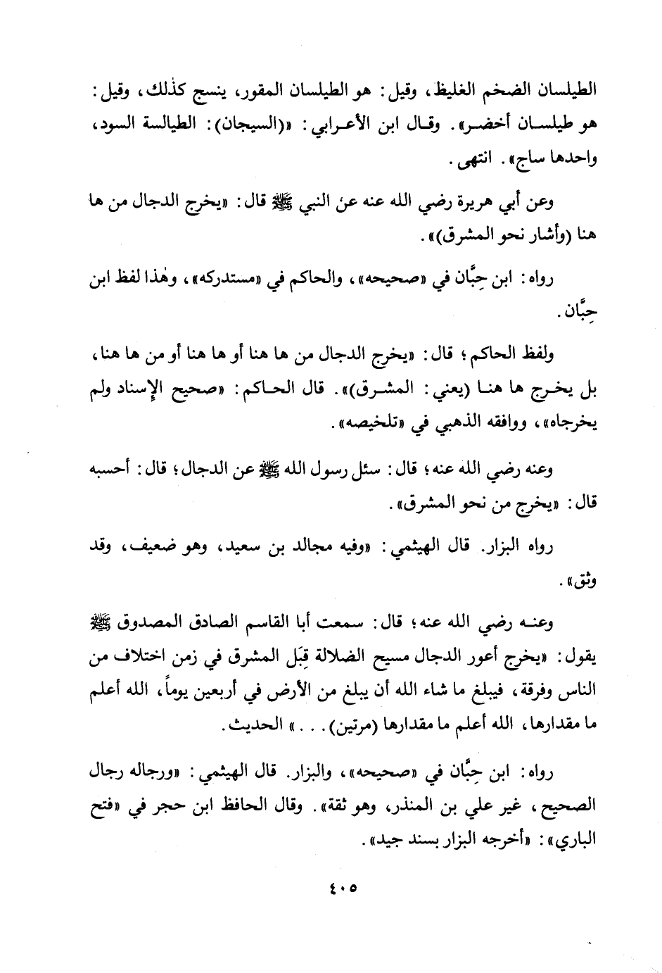 وعنه رضي الله عنه؛ قال: سمعت أبا القاسم الصادق المصدوق صلى الله عليه وسلم يقول: «يخرج أعور الدجال مسيح الضلالة قبل المشرق في زمن اختلاف من الناس وفرقة، فيبلغ ما شاء الله أن يبلغ من الأرض في أربعين يومًا، والله أعلم ما مقدارها، الله أعلم ما مقدارها (مرتين) ... » الحديث.
