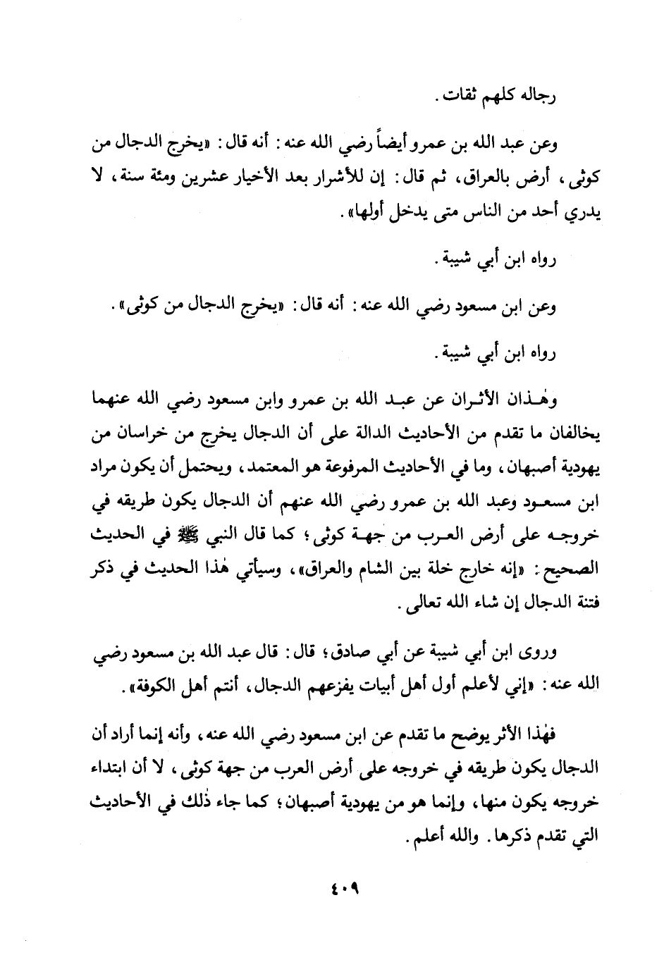 وهذان الأثران عن عبد الله بن عمرو وابن مسعود رضي الله عنهما يخالفان ما تقدم من الأحاديث الدالة على أن الدجال يخرج من خراسان من يهودية أصبهان، وما في الأحاديث المرفوعة هو المعتمد، ويحتمل أن يكون مراد ابن مسعود وعبد الله بن عمرو رضي الله عنهم أن الدجال يكون طريقه في خروجه على أرض العرب من جهة كوثى؛ كما قال النبي صلى الله عليه وسلم في الحديث الصحيح: «إنه خارج خلة بين الشام والعراق» ، وسيأتي هذا الحديث في ذكر فتنة الدجال إن شاء الله تعالى.