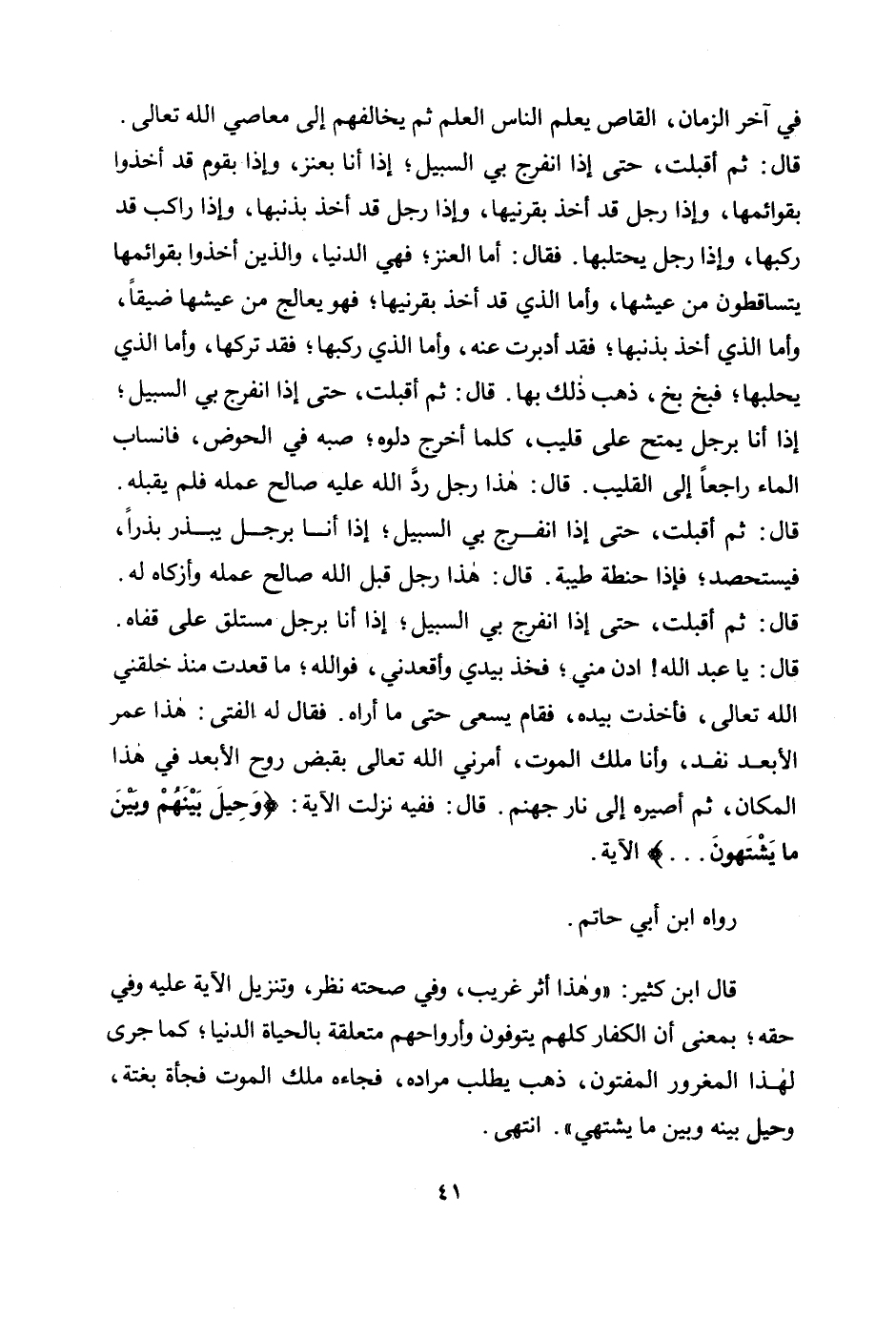 في آخر الزمان، القاص يعلم الناس العلم ثم يخالفهم إلى معاصي الله تعالى. قال: ثم أقبلت، حتى إذا انفرج بي السبيل؛ إذا أنا بعنز، وإذا بقوم قد أخذوا بقوائمها، وإذا رجل قد أخذ بقرنيها، وإذا رجل قد أخذ بذنبها، وإذا راكب قد ركبها، وإذا رجل يحتلبها. فقال: أما العنز؛ فهي الدنيا، والذين أخذوا بقوائمها يتساقطون من عيشها، وأما الذي قد أخذ بقرنيها؛ فهو يعالج من عيشها ضيقًا، وأما الذي أخذ بذنبها؛ فقد أدبرت عنه، وأما الذي ركبها؛ فقد تركها، وأما الذي يحلبها؛ فبخ بخ، ذهب ذلك بها. قال: ثم أقبلت، حتى إذا انفرج بي السبيل؛ إذا أنا برجل يمتح على قليب، كلما أخرج دلوه؛ صبه في الحوض، فانساب الماء راجعًا إلى القليب. قال: هذا رجل رد الله عليه صالح عمله فلم يقبله. قال: ثم أقبلت، حتى إذا انفرج بي السبيل؛ إذا أنا برجل يبذر بذرًا، فيستحصد؛ فإذا حنطة طيبة. قال: هذا رجل قبل الله صالح عمله وأزكاه له. قال: ثم أقبلت، حتى إذا انفرج بي السبيل؛ إذا أنا برجل مستلق على قفاه. قال: يا عبد الله! ادن مني؛ فخذ بيدي وأقعدني، فوالله؛ ما قعدت منذ خلقني الله تعالى، فأخذت بيده، فقام يسعى حتى ما أراه. فقال له الفتى: هذا عمر الأبعد نفد، وأنا ملك الموت، أمرني الله تعالى بقبض روح الأبعد في هذا المكان، ثم أصيره إلى نار جهنم. قال: ففيه نزلت الآية: {وَحِيلَ بَيْنَهُمْ وَبَيْنَ مَا يَشْتَهُونَ} الآية.