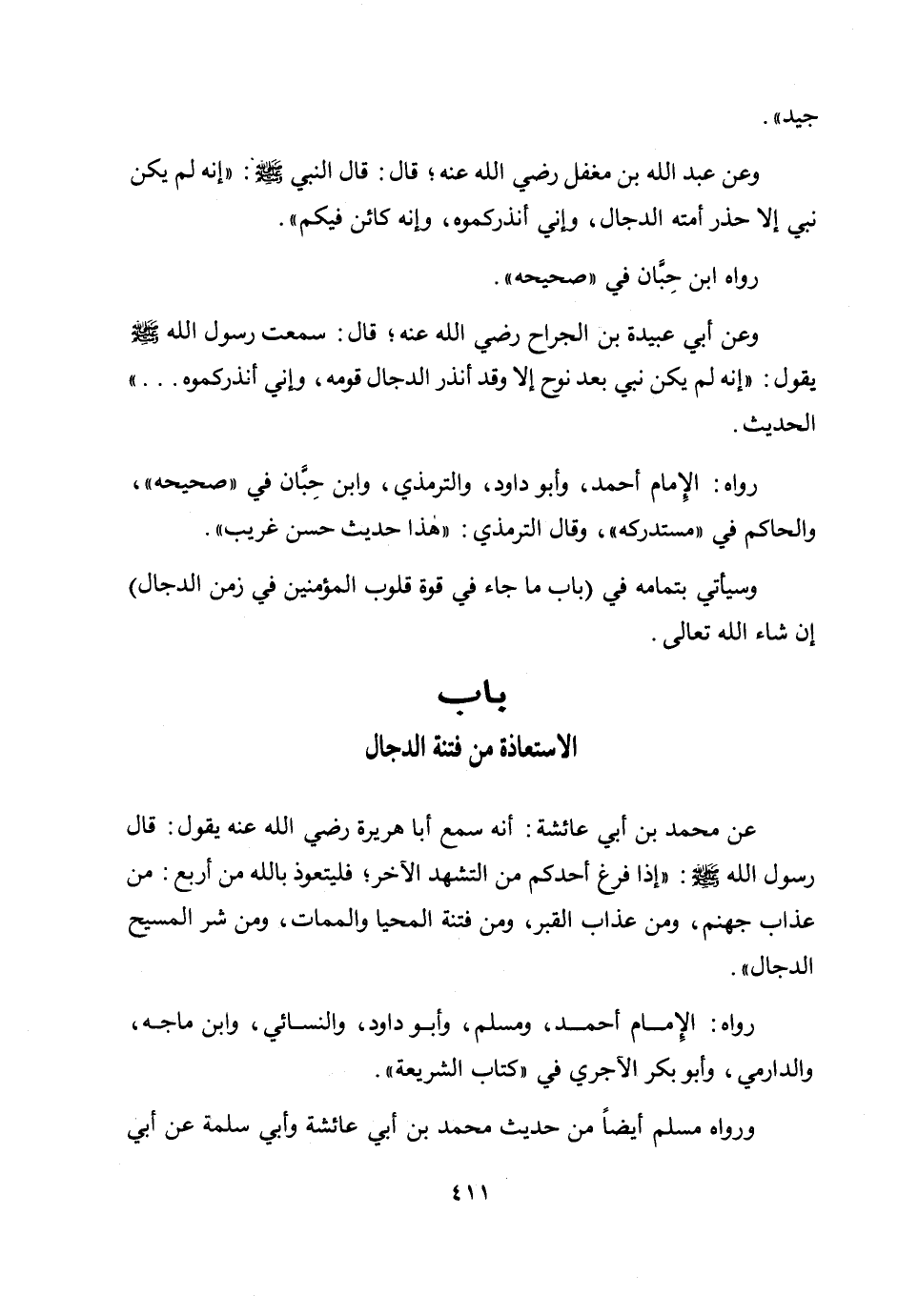 وعن عبد الله بن مغفل رضي الله عنه؛ قال: قال النبي صلى الله عليه وسلم: «إنه لم يكن نبي إلا حذر أمته الدجال، وإني أنذركموه، وإنه كائن فيكم» .