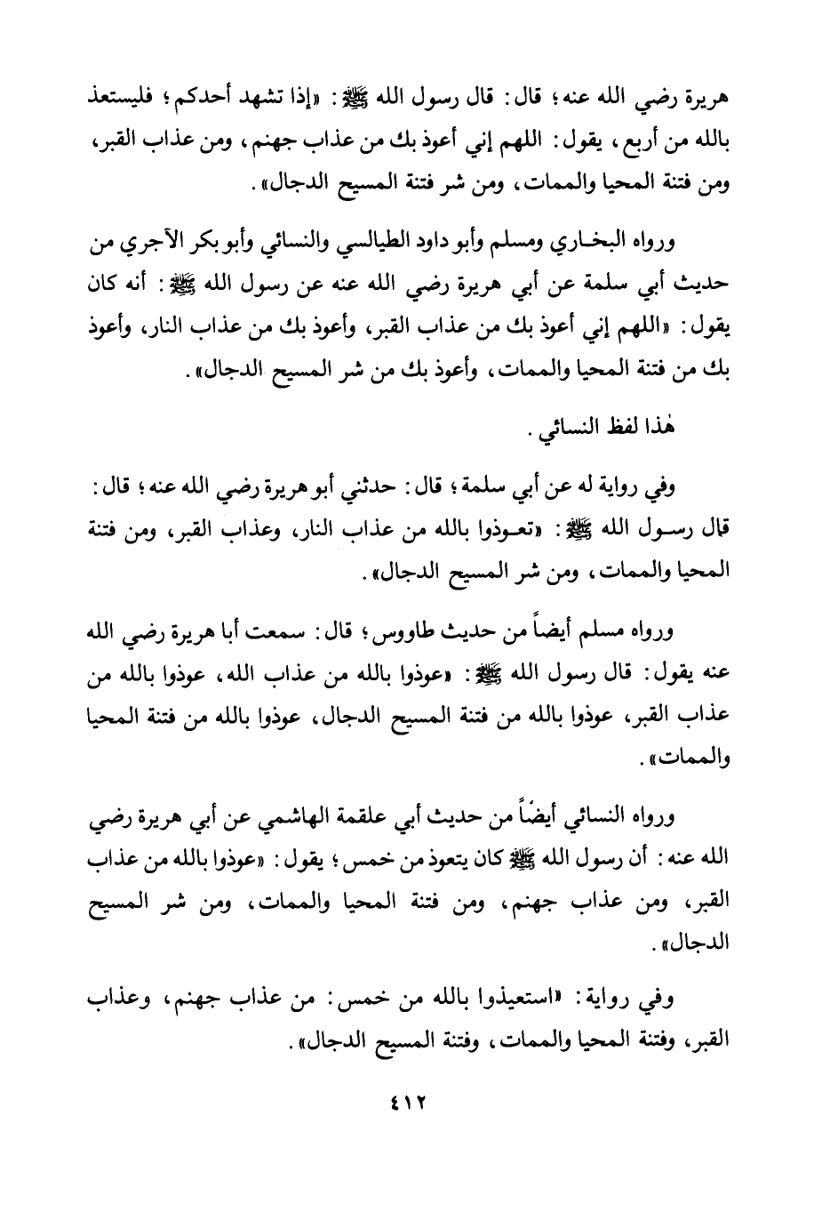 هريرة رضي الله عنه؛ قال: قال رسول الله صلى الله عليه وسلم: «إذا تشهد أحدكم؛ فليستعذ بالله من أربع، يقول: اللهم إني أعوذ بك من عذاب جهنم، ومن عذاب القبر، ومن فتنة المحيا والممات، ومن شر فتنة المسيح الدجال» .