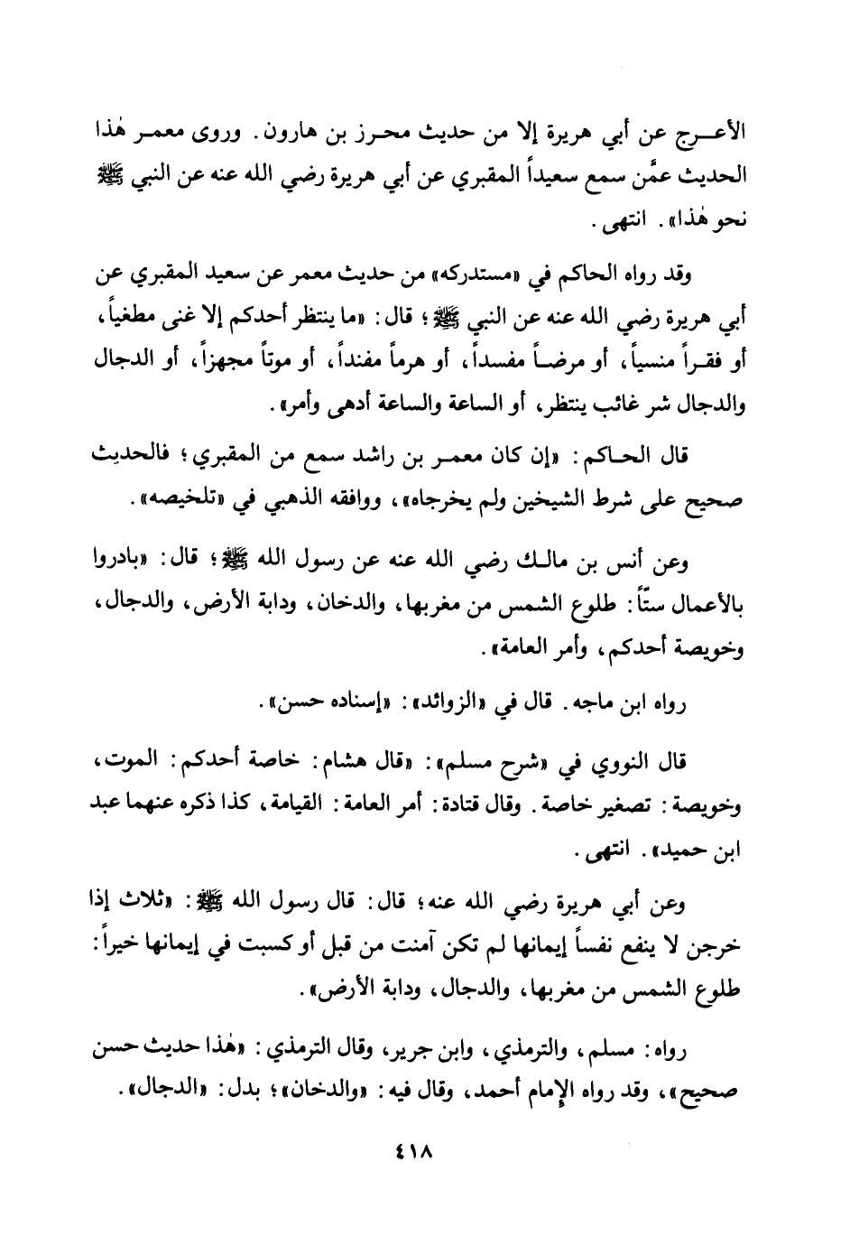 وقد رواه الحاكم في "مستدركه" من حديث معمر عن سعيد المقبري عن أبي هريرة رضي الله عنه عن النبي صلى الله عليه وسلم؛ قال: «ما ينتظر أحدكم إلا غنى مطغيًا، أو فقرًا منسيًا، أو مرضًا مفسدًا، أو هرمًا مفندًا، أو موتًا مجهزًا، أو الدجال والدجال شر غائب ينتظر، أو الساعة والساعة أدهى وأمر» .