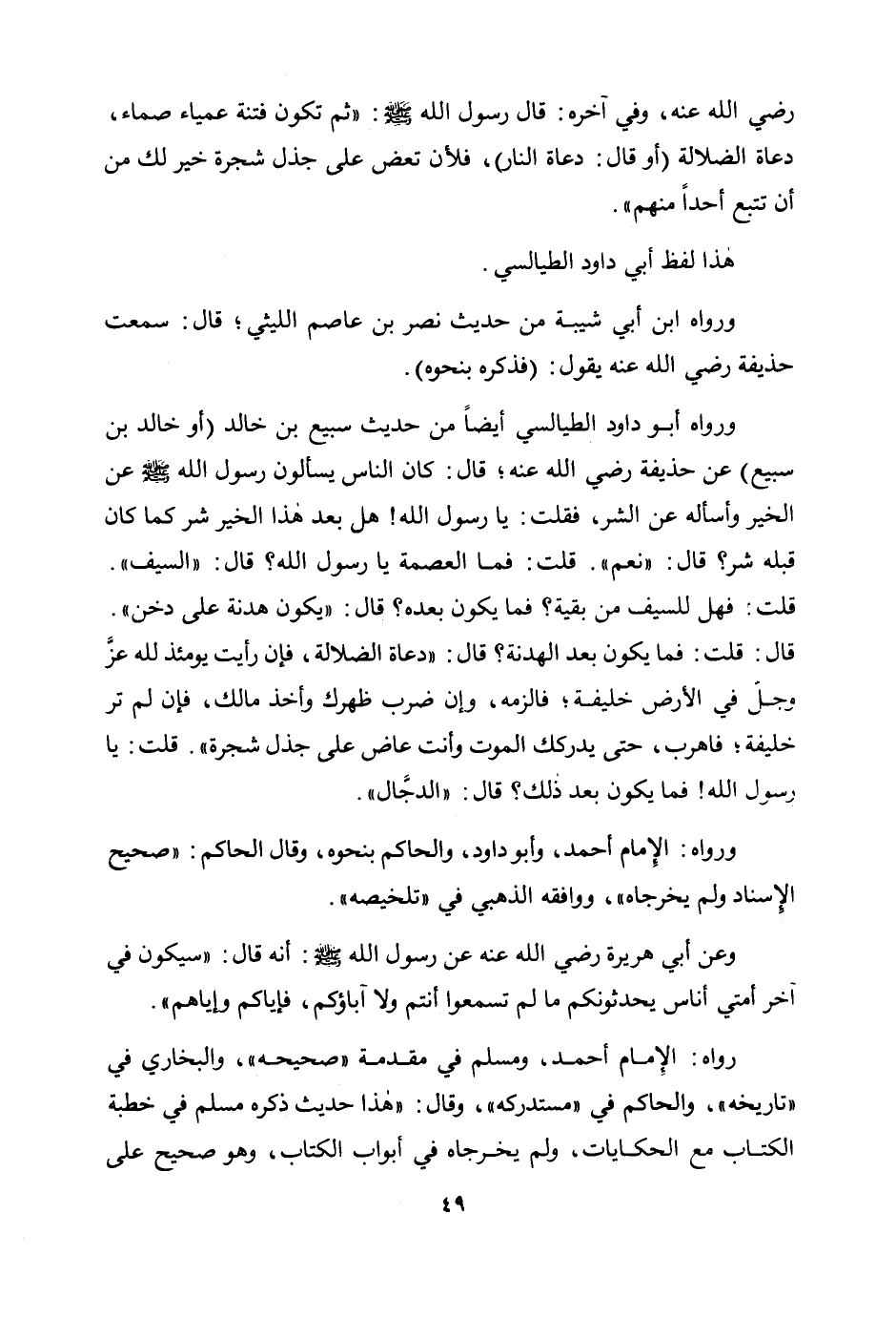 رضي الله عنه، وفي آخره: قال رسول الله صلى الله عليه وسلم: «ثم تكون فتنة عمياء صماء، دعاة الضلالة (أو قال: دعاة النار) ، فلأن تعض على جذل شجرة خير لك من أن تتبع أحدًا منهم» .
