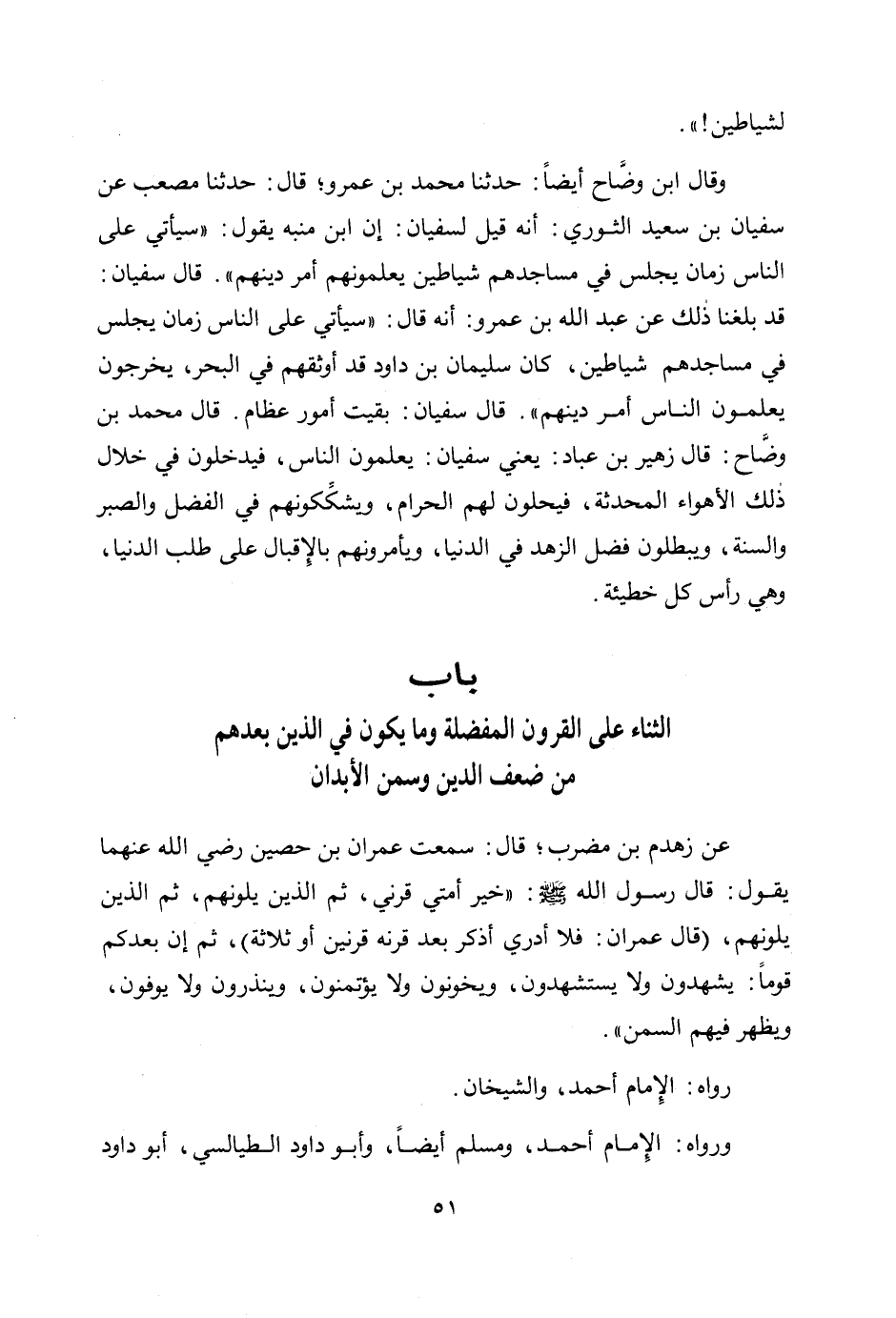 عن زهدم بن مضرب؛ قال: سمعت عمران بن حصين رضي الله عنهما يقول: قال رسول الله صلى الله عليه وسلم: «"خير أمتي قرني، ثم الذين يلونهم، ثم الذين يلونهم، (قال عمران: فلا أدري أذكر بعد قرنه قرنين أو ثلاثة) ، ثم إن بعدكم قومًا: يشهدون ولا يستشهدون، ويخونون ولا يؤتمنون، وينذرون ولا يوفون، ويظهر فيهم السمن"» .