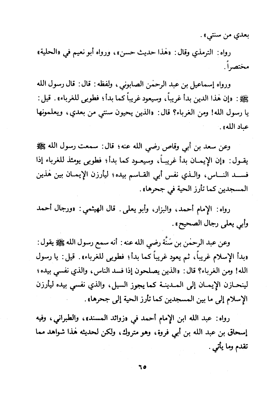 ورواه إسماعيل بن عبد الرحمن الصابوني، ولفظه: قال: قال رسول الله صلى الله عليه وسلم: «إن هذا الدين بدأ غريبًا، وسيعود غريبًا كما بدأ؛ فطوبى للغرباء". قيل: يا رسول الله! ومن الغرباء؟ قال: "الذين يحيون سنتي من بعدي، ويعلمونها عباد الله» .