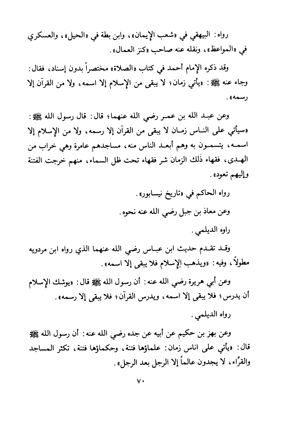 وعن عبد الله بن عمر رضي الله عنهما؛ قال: قال رسول الله صلى الله عليه وسلم: «سيأتي على الناس زمان لا يبقى من القرآن إلا رسمه، ولا من الإسلام إلا اسمه، يتسمون به وهم أبعد الناس منه، مساجدهم عامرة وهي خراب من الهدى، فقهاء ذلك الزمان شر فقهاء تحت ظل السماء، منهم خرجت الفتنة وإليهم تعود» .