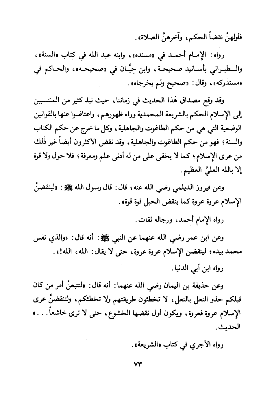 وعن فيروز الديلمي رضي الله عنه؛ قال: قال رسول الله صلى الله عليه وسلم: «لينقضن الإسلام عروة عروة كما ينقض الحبل قوة قوة» .