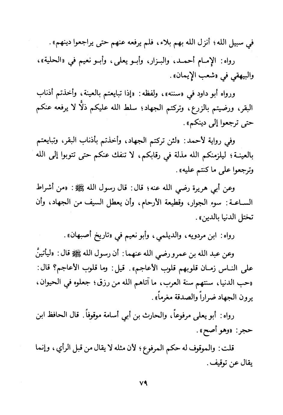 وفي رواية لأحمد: «لئن تركتم الجهاد، وأخذتم بأذناب البقر، وتبايعتم بالعينة؛ ليلزمنكم الله مذلة في رقابكم، لا تنفك عنكم حتى تتوبوا إلى الله وترجعوا على ما كنتم عليه» .