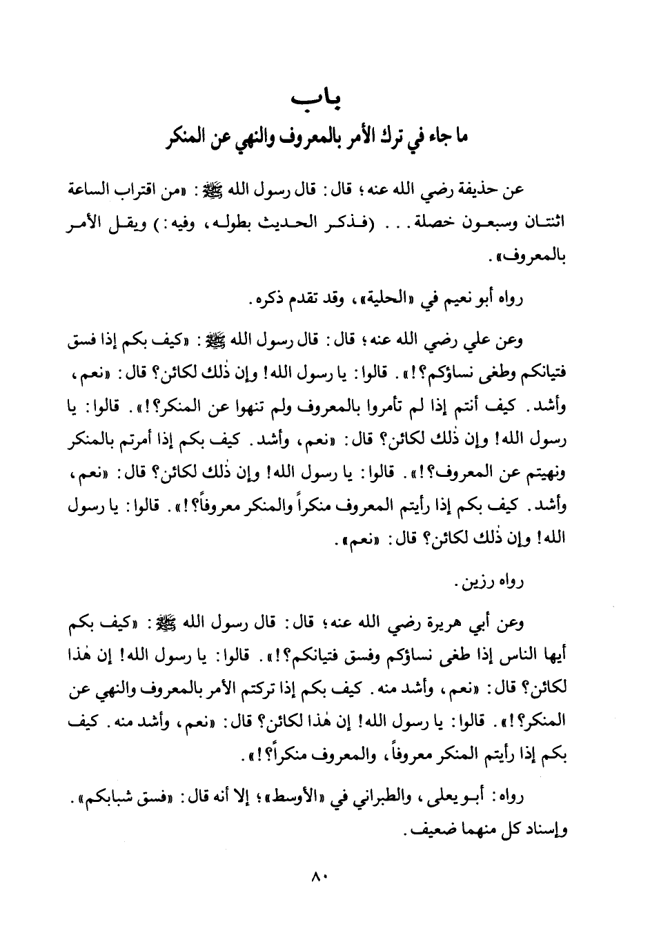 وعن أبي هريرة رضي الله عنه؛ قال: قال رسول الله صلى الله عليه وسلم: «" كيف بكم أيها الناس إذا طغى نساؤكم وفسق فتيانكم؟ ! ". قالوا: يا رسول الله! إن هذا لكائن؟ قال: "نعم، وأشد منه. كيف بكم إذا تركتم الأمر بالمعروف والنهي عن المنكر؟ ! ". قالوا: يا رسول الله! إن هذا لكائن؟ قال: "نعم، وأشد منه. كيف بكم إذا رأيتم المنكر معروفًا، والمعروف منكرًا؟ !» .