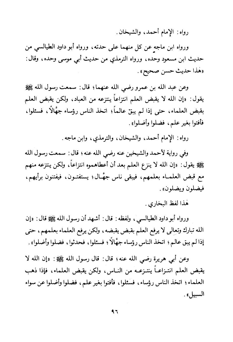 وعن عبد الله بن عمرو رضي الله عنهما؛ قال: سمعت رسول الله صلى الله عليه وسلم يقول: «إن الله لا يقبض العلم انتزاعًا ينتزعه من العباد، ولكن يقبض العلم بقبض العلماء، حتى إذا لم يبق عالمًا؛ اتخذ الناس رؤساء جهالًا، فسئلوا، فأفتوا بغير علم، فضلوا وأضلوا» .