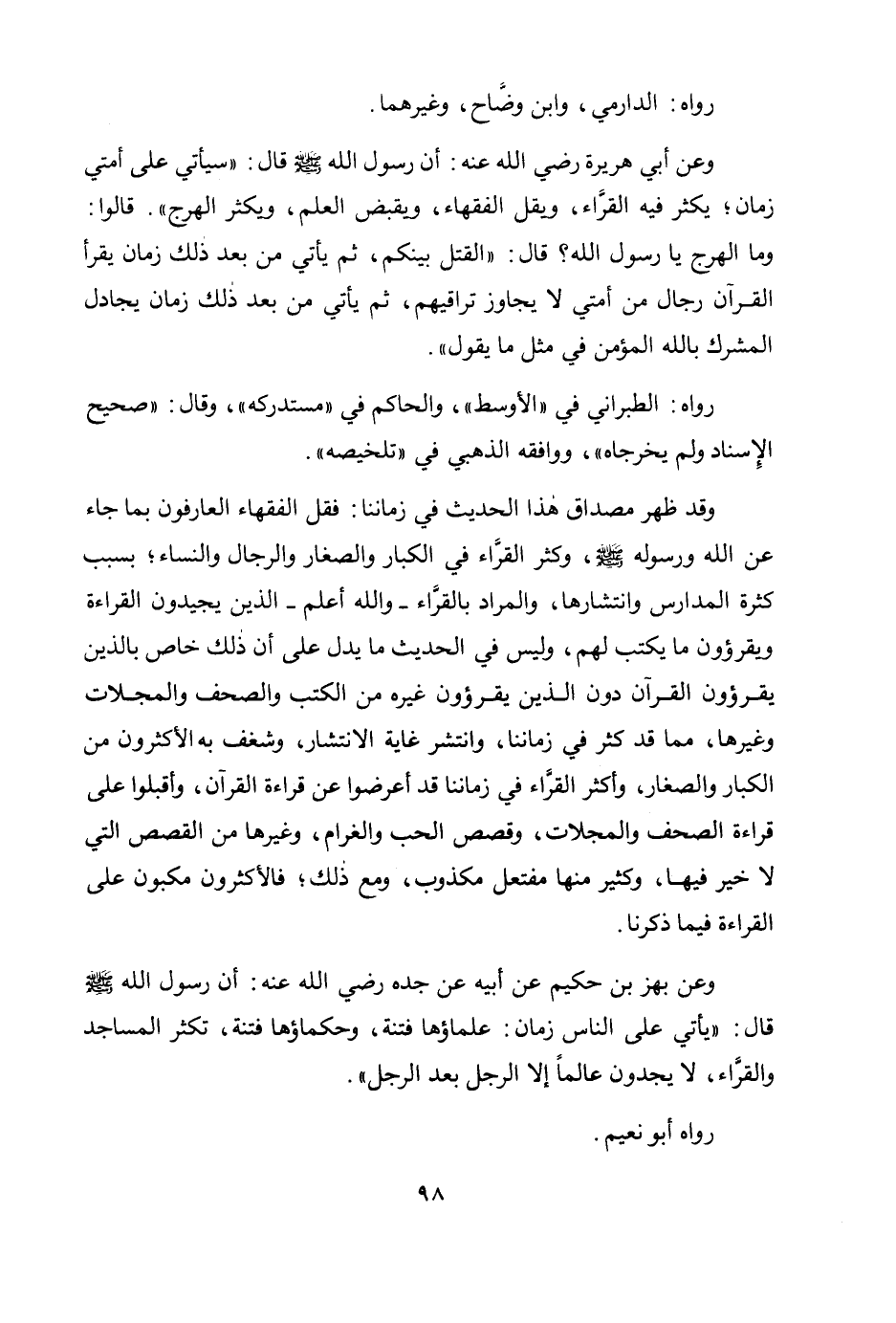 وعن أبي هريرة رضي الله عنه: أن رسول الله صلى الله عليه وسلم قال: «سيأتي على أمتي زمان؛ يكثر فيه القراء، ويقل الفقهاء، ويقبض العلم، ويكثر الهرج ". قالوا: وما الهرج يا رسول الله؟ قال: "القتل بينكم، ثم يأتي من بعد ذلك زمان يقرأ القرآن رجال من أمتي لا يجاوز تراقيهم، ثم يأتي من بعد ذلك زمان يجادل المشرك بالله المؤمن في مثل ما يقول» .