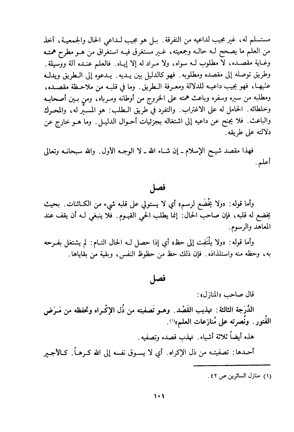 مُسْتَسْلِمٌ لَهُ، غَيْرُ مُجِيبٍ لِدَاعِيهِ مِنَ التَّفْرِقَةِ. بَلْ هُوَ مُجِيبٌ لِدَاعِي الْحَالِ وَالْجَمْعِيَّةِ، آخِذٌ مِنَ الْعِلْمِ مَا يُصَحِّحُ لَهُ حَالَهُ وَجَمْعِيَّتَهُ، غَيْرُ مُسْتَغْرِقٍ فِيهِ اسْتِغْرَاقَ مَنْ هُوَ مُطْرِحٌ هِمَّتَهُ وَغَايَةَ مَقْصِدِهِ، لَا مَطْلُوبَ لَهُ سِوَاهُ، وَلَا مُرَادَ لَهُ إِلَّا إِيَّاهُ. فَالْعِلْمُ عِنْدَهُ آلَةٌ وَوَسِيلَةٌ. وَطَرِيقٌ تُوصِلُهُ إِلَى مَقْصِدِهِ وَمَطْلُوبِهِ. فَهُوَ كَالدَّلِيلِ بَيْنَ يَدَيْهِ. يَدْعُوهُ إِلَى الطَّرِيقِ وَيَدُلُّهُ عَلَيْهَا، فَهُوَ يُجِيبُ دَاعِيَهُ لِلدَّلَالَةِ وَمَعْرِفَةِ الطَّرِيقِ. وَمَا فِي قَلْبِهِ مِنْ مُلَاحَظَةِ مَقْصِدِهِ، وَمَطْلَبِهِ مِنْ سَيْرِهِ وَسَفَرِهِ وَبَاعِثِ هِمَّتِهِ عَلَى الْخُرُوجِ مِنْ أَوْطَانِهِ وَمُرَبَّاهُ، وَمِنْ بَيْنِ أَصْحَابِهِ وَخُلَطَائِهِ. الْحَامِلُ لَهُ عَلَى الِاغْتِرَابِ. وَالتَّفَرُّدُ فِي طَرِيقِ الطَّلَبِ: هُوَ الْمَسِيرُ لَهُ، وَالْمُحَرِّكُ وَالْبَاعِثُ. فَلَا يَجْنَحُ عَنْ دَاعِيهِ إِلَى اشْتِغَالِهِ بِجُزَيْئَاتِ أَحْوَالِ الدَّلِيلِ. وَمَا هُوَ خَارِجٌ عَنْ دَلَالَتِهِ عَلَى طَرِيقِهِ.