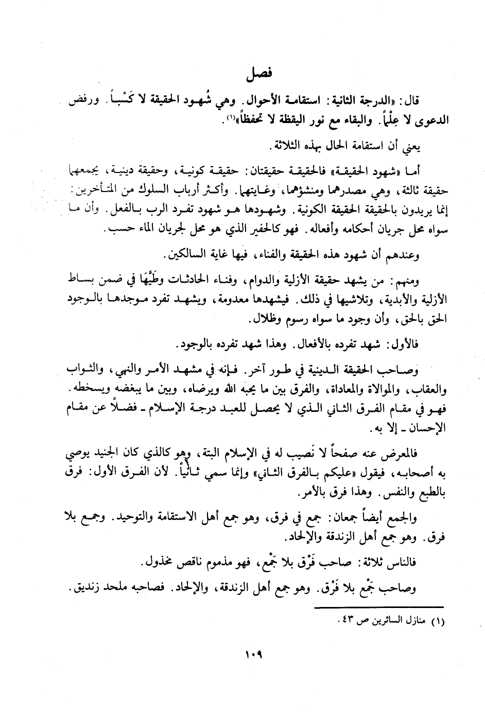 أَمَّا شُهُودُ الْحَقِيقَةِ فَالْحَقِيقَةُ حَقِيقَتَانِ: حَقِيقَةٌ كَوْنِيَّةٌ، وَحَقِيقَةٌ دِينِيَّةٌ، يَجْمَعُهُمَا حَقِيقَةٌ ثَالِثَةٌ، وَهِيَ مَصْدَرُهُمَا وَمَنْشَؤُهُمَا، وَغَايَتُهُمَا. وَأَكْثَرُ أَرْبَابِ السُّلُوكِ مِنَ الْمُتَأَخِّرِينَ: إِنَّمَا يُرِيدُونَ بِالْحَقِيقَةِ الْحَقِيقَةَ الْكَوْنِيَّةَ. وَشُهُودُهَا هُوَ شُهُودُ تَفَرُّدِ الرَّبِّ بِالْفِعْلِ. وَأَنَّ مَا سِوَاهُ مَحَلُّ جَرَيَانِ أَحْكَامِهِ وَأَفْعَالِهِ. فَهُوَ كَالْحَفِيرِ الَّذِي هُوَ مَحَلٌّ لِجَرَيَانِ الْمَاءِ حَسْبُ.