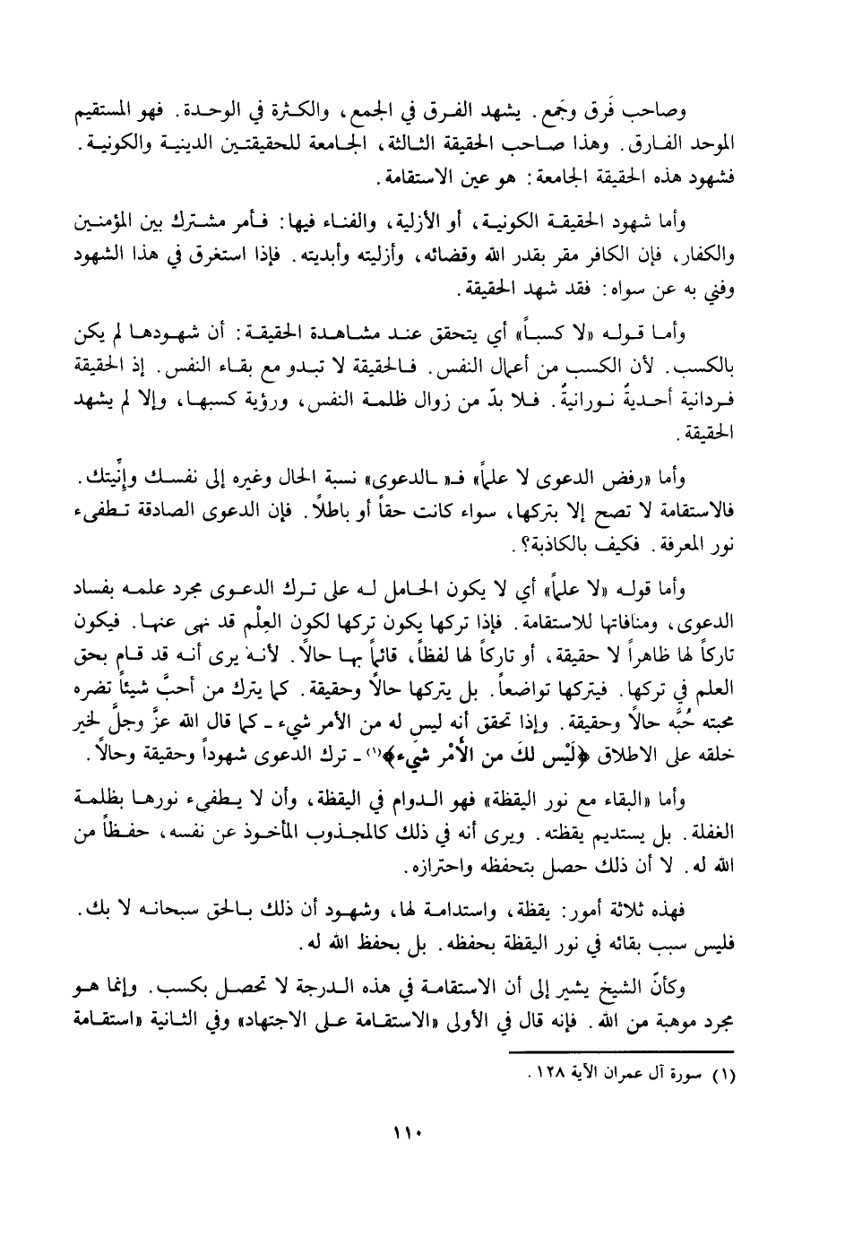 وَصَاحِبُ فَرْقٍ وَجَمْعٍ. يَشْهَدُ الْفَرْقَ فِي الْجَمْعِ، وَالْكَثْرَةَ فِي الْوَحْدَةِ. فَهُوَ الْمُسْتَقِيمُ الْمُوَحِّدُ الْفَارِقُ. وَهَذَا صَاحِبُ الْحَقِيقَةِ الثَّالِثَةِ، الْجَامِعَةُ لِلْحَقِيقَتَيْنِ الدِّينِيَّةِ وَالْكَوْنِيَّةِ. فَشُهُودُ هَذِهِ الْحَقِيقَةِ الْجَامِعَةِ: هُوَ عَيْنُ الِاسْتِقَامَةِ.
