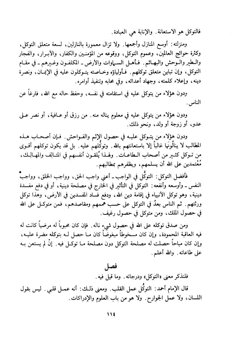 وَمَنْزِلَتُهُ أَوْسَعُ الْمَنَازِلِ وَأَجْمَعُهَا. وَلَا تَزَالُ مَعْمُورَةً بِالنَّازِلِينَ، لِسَعَةِ مُتَعَلِّقِ التَّوَكُّلِ، وَكَثْرَةِ حَوَائِجَ الْعَالَمِينَ، وَعُمُومِ التَّوَكُّلِ، وَوُقُوعِهِ مِنَ الْمُؤْمِنِينَ وَالْكُفَّارِ، وَالْأَبْرَارِ وَالْفُجَّارِ، وَالطَّيْرِ وَالْوَحْشِ وَالْبَهَائِمِ. فَأَهْلُ السَّمَاوَاتِ وَالْأَرْضِ - الْمُكَلَّفُونَ وَغَيْرُهُمْ - فِي مَقَامِ التَّوَكُّلِ، وَإِنْ تَبَايَنَ مُتَعَلِّقُ تَوَكُّلِهِمْ. فَأَوْلِيَاؤُهُ وَخَاصَّتُهُ يَتَوَكَّلُونَ عَلَيْهِ فِي الْإِيمَانِ، وَنُصْرَةِ دِينِهِ، وَإِعْلَاءِ كَلِمَتِهِ، وَجِهَادِ أَعْدَائِهِ، وَفِي مَحَابِّهِ وَتَنْفِيذِ أَوَامِرِهِ.