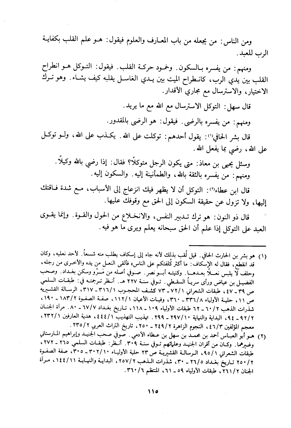 وَمِنَ النَّاسِ مَنْ يَجْعَلُهُ مِنْ بَابِ الْمَعَارِفِ وَالْعُلُومِ فَيَقُولُ: هُوَ عِلْمُ الْقَلْبِ بِكِفَايَةِ الرَّبِّ لِلْعَبْدِ.