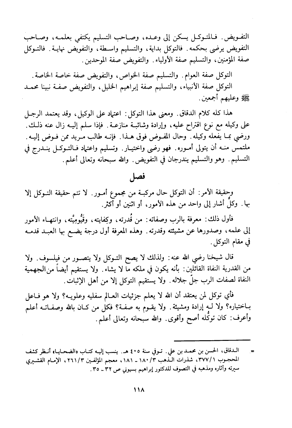 هَذَا كُلُّهُ كَلَامُ الدَّقَّاقِ. وَمَعْنَى هَذَا التَّوَكُّلِ اعْتِمَادٌ عَلَى الْوَكِيلِ، وَقَدْ يَعْتَمِدُ الرَّجُلُ عَلَى وَكِيلِهِ مَعَ نَوْعِ اقْتِرَاحٍ عَلَيْهِ، وَإِرَادَةٍ وَشَائِبَةِ مُنَازَعَةٍ. فَإِذَا سَلَّمَ إِلَيْهِ زَالَ عَنْهُ ذَلِكَ. وَرَضِيَ بِمَا يَفْعَلُهُ وَكِيلُهُ. وَحَالُ الْمُفَوَّضِ فَوْقَ هَذَا. فَإِنَّهُ طَالِبٌ مُرِيدٌ مِمَّنْ فَوَّضَ إِلَيْهِ، مُلْتَمِسٌ مِنْهُ أَنْ يَتَوَلَّى أُمُورَهُ. فَهُوَ رِضًا وَاخْتِيَارٌ، وَتَسْلِيمٌ وَاعْتِمَادٌ، فَالتَّوَكُّلُ يَنْدَرِجُ فِي التَّسْلِيمِ، وَهُوَ وَالتَّسْلِيمُ يَنْدَرِجَانِ فِي التَّفْوِيضِ. وَاللَّهُ سُبْحَانَهُ وَتَعَالَى أَعْلَمُ.