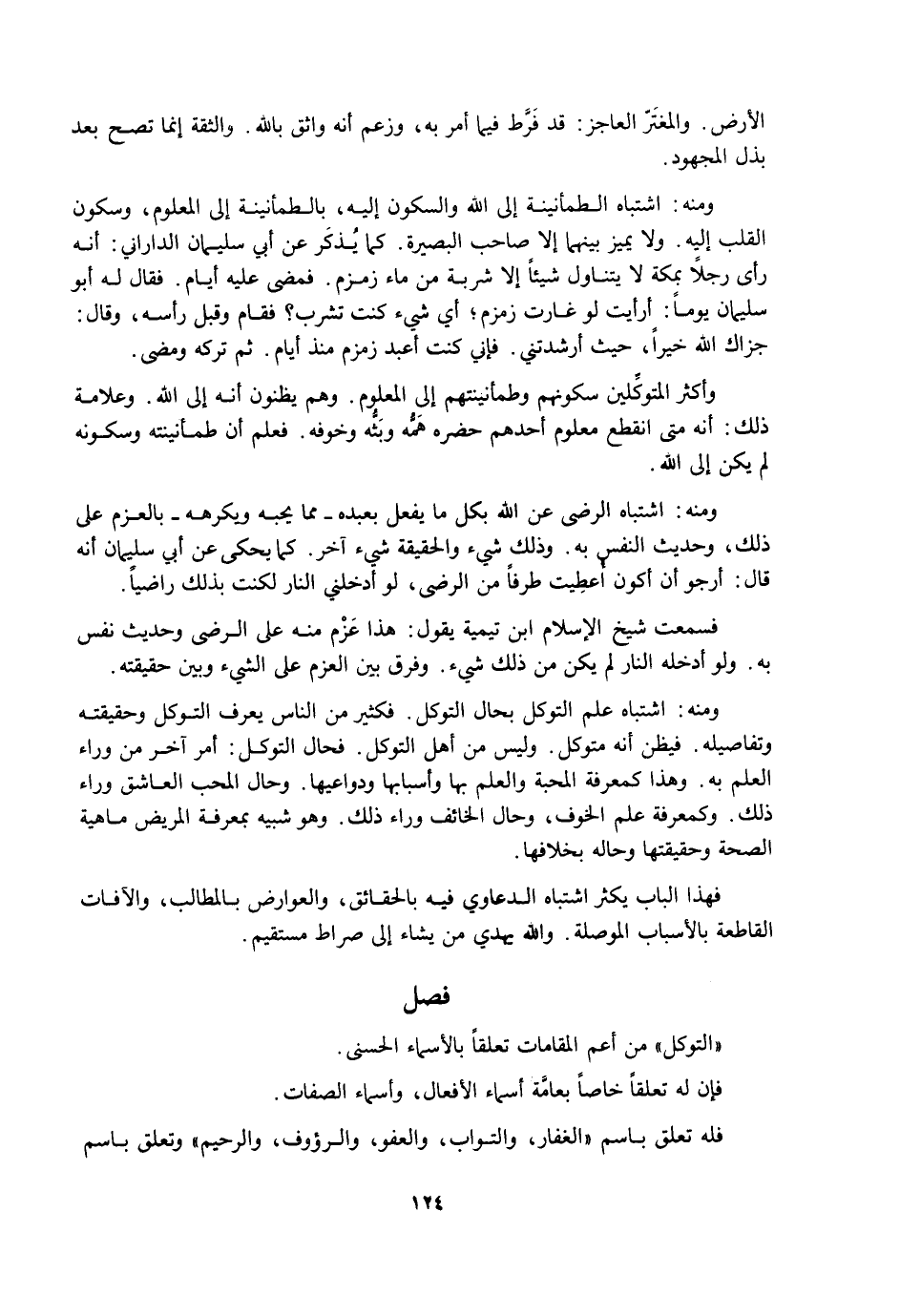 فَهَذَا الْبَابُ يَكْثُرُ اشْتِبَاهُ الدَّعَاوِي فِيهِ بِالْحَقَائِقِ، وَالْعَوَارِضِ بِالْمَطَالِبِ، وَالْآفَاتِ الْقَاطِعَةِ بِالْأَسْبَابِ الْمُوَصِّلَةِ. وَاللَّهُ يَهْدِي مَنْ يَشَاءُ إِلَى صِرَاطٍ مُسْتَقِيمٍ.