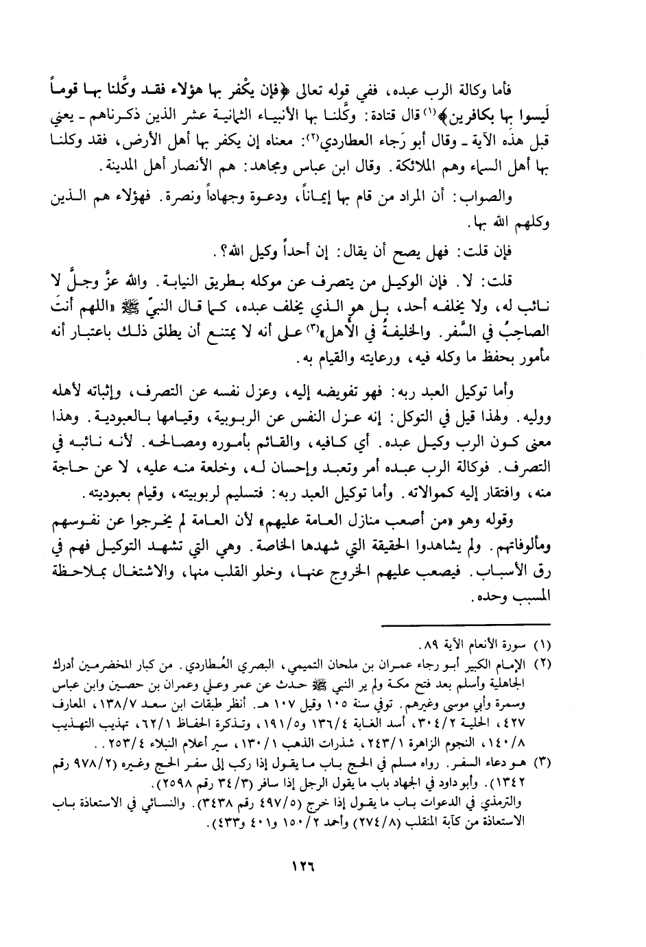 فَأَمَّا وَكَالَةُ الرَّبِّ عَبْدَهُ، فَفِي قَوْلِهِ تَعَالَى: {فَإِنْ يَكْفُرْ بِهَا هَؤُلَاءِ فَقَدْ وَكَّلْنَا بِهَا قَوْمًا لَيْسُوا بِهَا بِكَافِرِينَ} [الأنعام: 89] قَالَ قَتَادَةُ: وَكَّلْنَا بِهَا الْأَنْبِيَاءَ الثَّمَانِيَةَ عَشَرَ الَّذِينَ ذَكَرْنَاهُمْ - يَعْنِي قَبْلَ هَذِهِ الْآيَةِ - وَقَالَ أَبُو رَجَاءٍ الْعُطَارِدِيُّ: مَعْنَاهُ: إِنْ يَكْفُرْ بِهَا أَهْلُ الْأَرْضِ، فَقَدْ وَكَّلْنَا بِهَا أَهْلَ السَّمَاءِ وَهُمُ الْمَلَائِكَةُ. وَقَالَ ابْنُ عَبَّاسٍ وَمُجَاهِدٌ: هُمُ الْأَنْصَارُ أَهْلُ الْمَدِينَةِ.