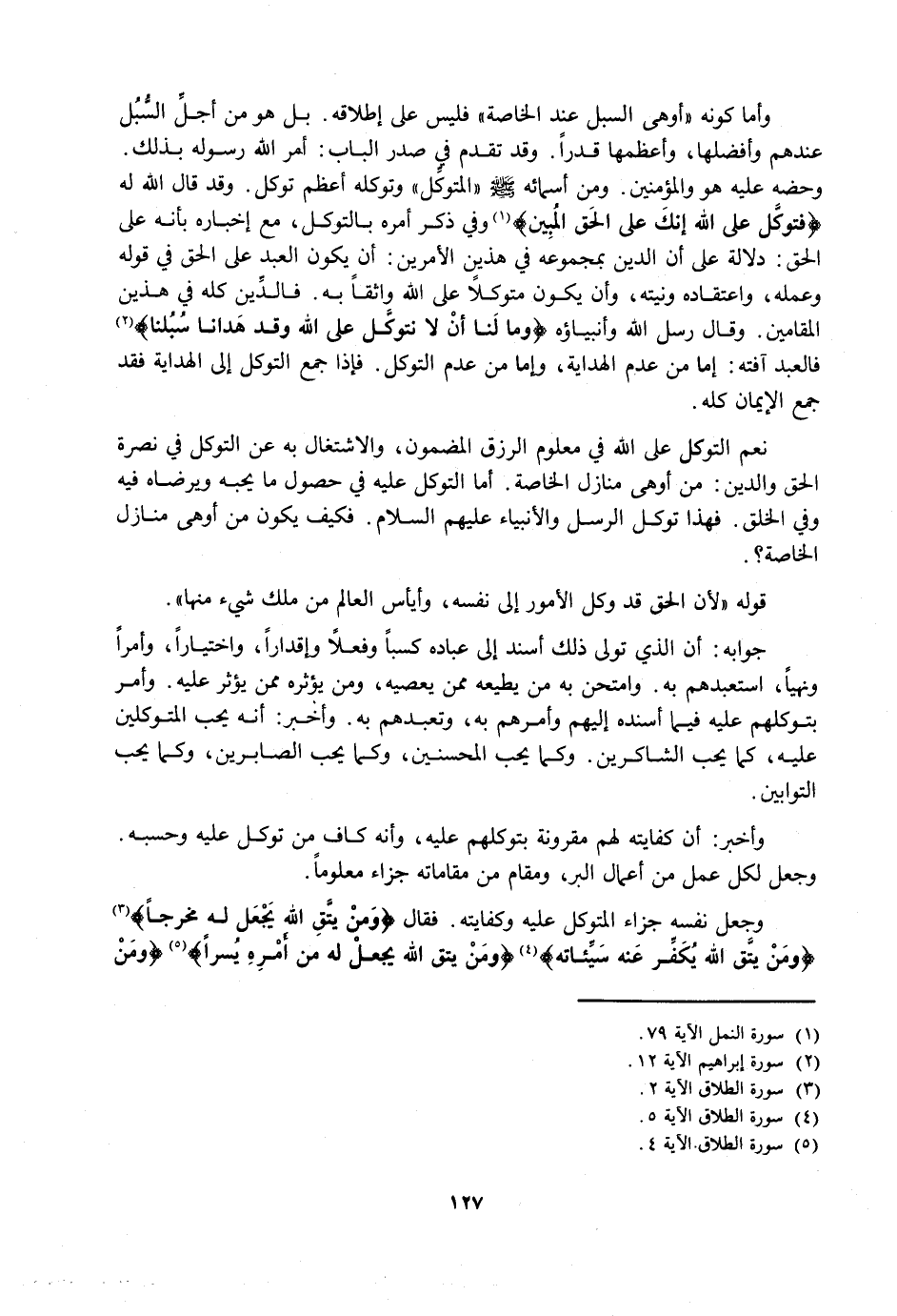 نَعَمْ، التَّوَكُّلُ عَلَى اللَّهِ فِي مَعْلُومِ الرِّزْقِ الْمَضْمُونِ، وَالِاشْتِغَالُ بِهِ عَنِ التَّوَكُّلِ فِي نُصْرَةِ الْحَقِّ وَالدِّينِ مِنْ أَوْهَى مَنَازِلِ الْخَاصَّةِ. أَمَّا التَّوَكُّلُ عَلَيْهِ فِي حُصُولِ مَا يُحِبُّهُ وَيَرْضَاهُ فِيهِ وَفِي الْخَلْقِ، فَهَذَا تَوَكُّلُ الرُّسُلِ وَالْأَنْبِيَاءِ عَلَيْهِمُ السَّلَامُ. فَكَيْفَ يَكُونُ مِنْ أَوْهَى مَنَازِلِ الْخَاصَّةِ؟