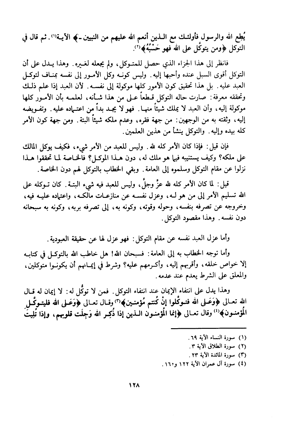، {وَمَنْ يُطِعِ اللَّهَ وَالرَّسُولَ فَأُولَئِكَ مَعَ الَّذِينَ أَنْعَمَ اللَّهُ عَلَيْهِمْ مِنَ النَّبِيِّينَ} [النساء: 69]- الْآيَةَ، ثُمَّ قَالَ فِي التَّوَكُّلِ: {وَمَنْ يَتَوَكَّلْ عَلَى اللَّهِ فَهُوَ حَسْبُهُ} [الطلاق: 3] .