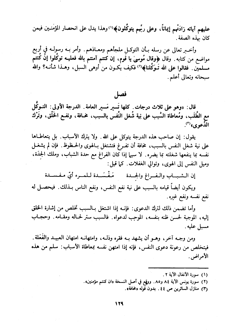 يَقُولُ: إِنَّ صَاحِبَ هَذِهِ الدَّرَجَةِ يَتَوَكَّلُ عَلَى اللَّهِ. وَلَا يَتْرُكُ الْأَسْبَابَ. بَلْ يَتَعَاطَاهَا عَلَى نِيَّةِ شُغْلِ النَّفْسِ بِالسَّبَبِ، مَخَافَةَ أَنْ تَفْرُغَ فَتَشْتَغِلَ بِالْهَوَى وَالْحُظُوظِ. فَإِنْ لَمْ يَشْغَلْ نَفْسَهُ بِمَا يَنْفَعُهَا شَغَلَتْهُ بِمَا يَضُرُّهُ. لَا سِيَّمَا إِذَا كَانَ الْفَرَاغُ مَعَ حِدَّةِ الشَّبَابِ، وَمِلْكِ الْجِدَّةِ، وَمَيْلِ النَّفْسِ إِلَى الْهَوَى، وَتَوَالِي الْغَفَلَاتِ. كَمَا قِيلَ: