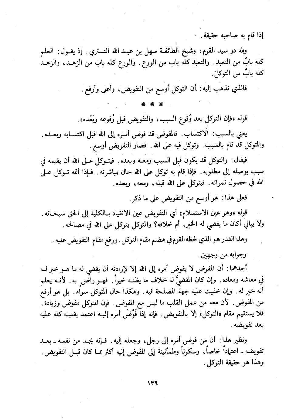 وَلِلَّهِ دَرُّ سَيِّدِ الْقَوْمِ، وَشَيْخِ الطَّائِفَةِ سَهْلِ بْنِ عَبْدِ اللَّهِ التُّسْتَرِيِّ؛ إِذْ يَقُولُ: الْعِلْمُ كُلُّهُ بَابٌ مِنَ التَّعَبُّدِ. وَالتَّعَبُّدُ كُلُّهُ بَابٌ مِنَ الْوَرَعِ. وَالْوَرَعُ كُلُّهُ بَابٌ مِنَ الزُّهْدِ، وَالزُّهْدُ كُلُّهُ بَابٌ مِنَ التَّوَكُّلِ.