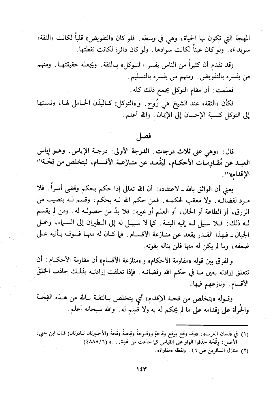 قَالَ: وَهِيَ عَلَى ثَلَاثِ دَرَجَاتٍ: الدَّرَجَةُ الْأُولَى: دَرَجَةُ الْإِيَاسِ. وَهُوَ إِيَاسُ الْعَبْدِ عَنْ مُقَاوَمَاتِ الْأَحْكَامِ. لِيَقْعُدَ عَنْ مُنَازَعَةِ الْأَقْسَامِ، لِيَتَخَلَّصَ مِنْ قِحَةِ الْإِقْدَامِ.