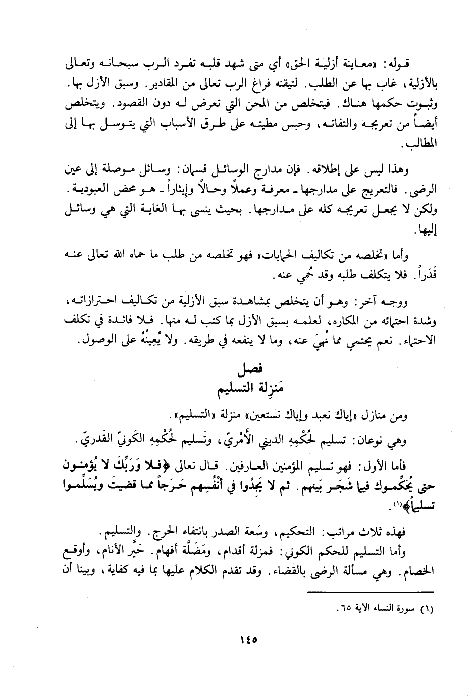 وَمِنْ مَنَازِلِ: {إِيَّاكَ نَعْبُدُ وَإِيَّاكَ نَسْتَعِينُ} [الفاتحة: 5] مَنْزِلَةُ التَّسْلِيمِ