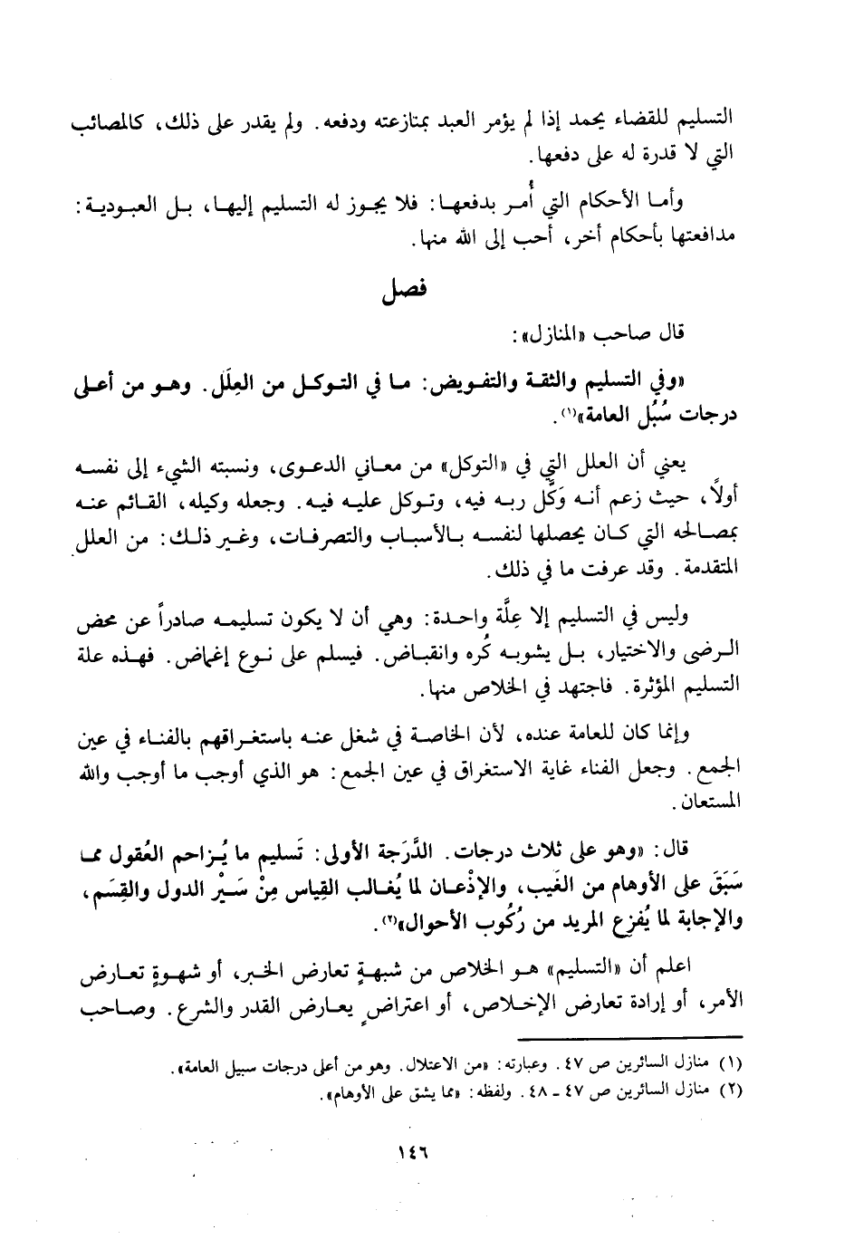 وَفِي التَّسْلِيمِ وَالثِّقَةِ وَالتَّفْوِيضِ: مَا فِي التَّوَكُّلِ مِنَ الْعِلَلِ. وَهُوَ مِنْ أَعْلَى دَرَجَاتِ سُبُلِ الْعَامَّةِ.